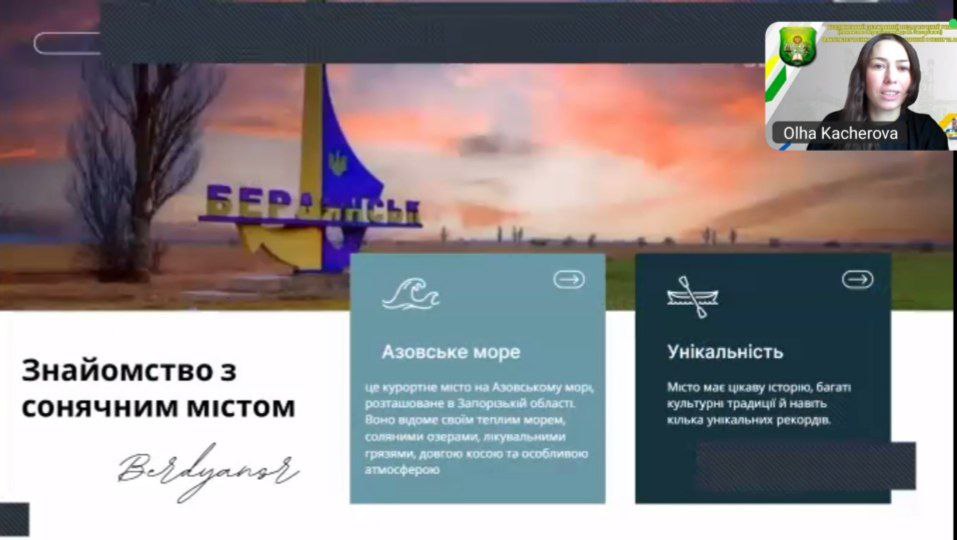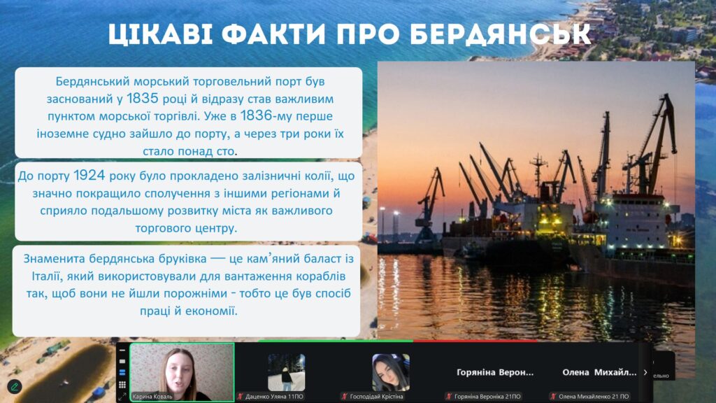 Онлайн-зустріч зі студентами 21ПО групи спеціальності 013 Початкова освіта (кураторка ас. Карина Коваль) була присвячена темі любові до перлини Північного Приазов’я. Присутні ділилися теплими спогадами, мріяли про квітуче майбутнє незламного Бердянська. Інтерактивна частина заходу створила невимушену, затишну атмосферу, наповнену щирістю та душевним теплом.