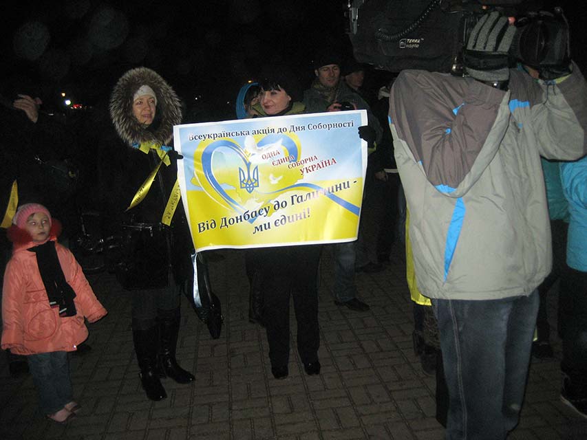 Сьогодні, 22 січня, патріоти України збиралися в різних містах, щоб відзначити День Соборності та зв’язати стрічку єдності, яка потім мандруватиме Україною. З якого б міста ми не походили, де б зараз не перебували – Україна завжди в нашому серці! Одна і єдина, тільки разом з Донбасом і Кримом! Стартувала акція о 18-ій годині і в Бердянську – на приморській площі (див. світлини). Учасники зв’язували «стрічки єдності», на яких кожний фломастером виписував своє особисте побажання щодо майбутнього України…