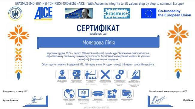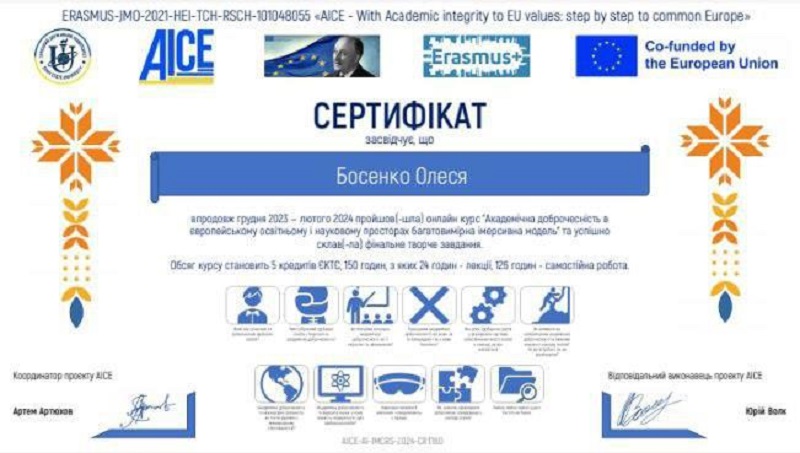 Саме тому впродовж грудня 2023 – лютого 2024 року (два з половиною місяці) здобувачі гуманітарно-економічного факультету, зокрема кафедри історії та філософії: Яковець Ольга, Босенко Олеся та Молярова Лілія, пройшли освітній курс для студентів та аспірантів «Академічна доброчесність в європейському освітньому і науковому просторах: багатовимірна імерсивна модель», який вже вдруге проводився в рамках проєкту проєкту «AICE – With Academic integrity to EU values: step by step to common Europe». Проєкт співфінансується Виконавчим агентством ЄС з освіти, аудіовізуальних засобів та культури в рамках напряму «Жан Моне» програми Erasmus+.