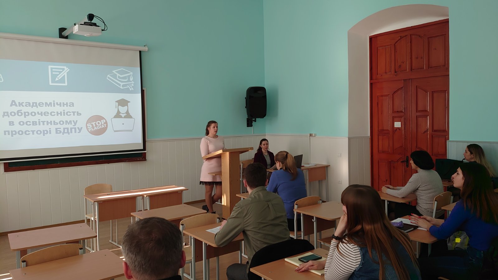 4 березня 2020 року у головному корпусі БДПУ для студентів гуманітарно-економічного факультету силами працівників бібліотеки було проведено захід присвячений Академічній доброчесності в освітньому просторі БДПУ. Здобувачі вищої освіти мали змогу ознайомитися з новітніми вимогами до оформлення, написання та захисту випускних кваліфікаційних робіт. Працівники бібліотеки звернули увагу присутніх на різновиди академічної недоброчесності та підкреслили яка відповідальність чекає кожного, хто буде порушувати норми. Захід викликав зацікавленість у  слухачів, а саме у студентів випускних курсів, тому що вони зіткнуться з цим у найближчий час. Такі заходи мають велике значення в якісній підготовці фахівців різних спеціальностей.