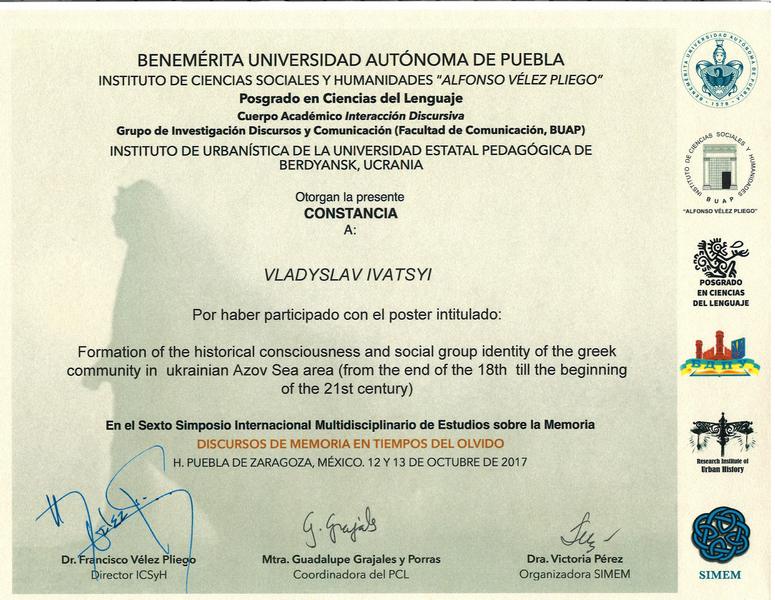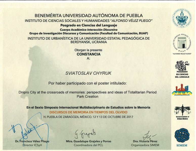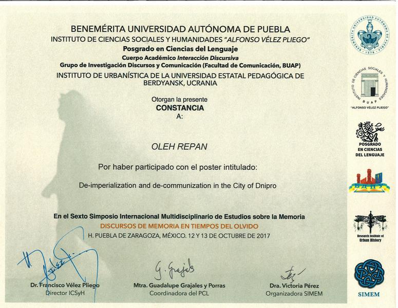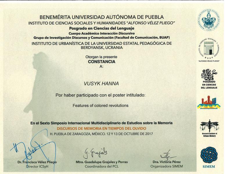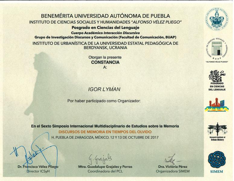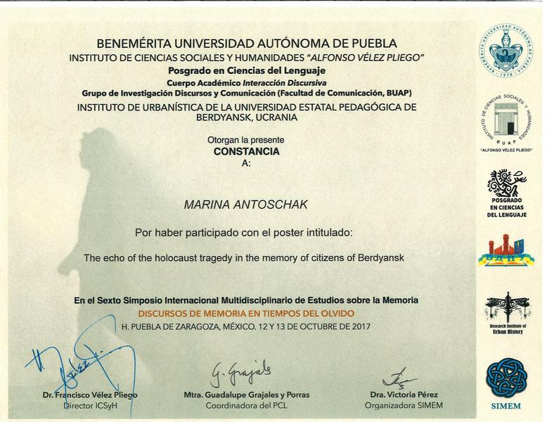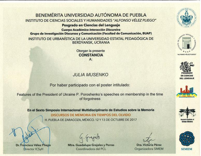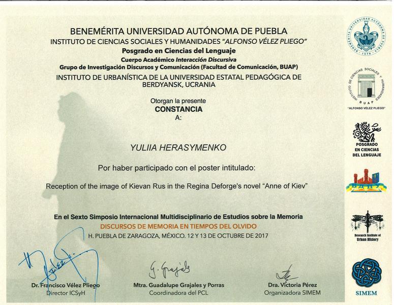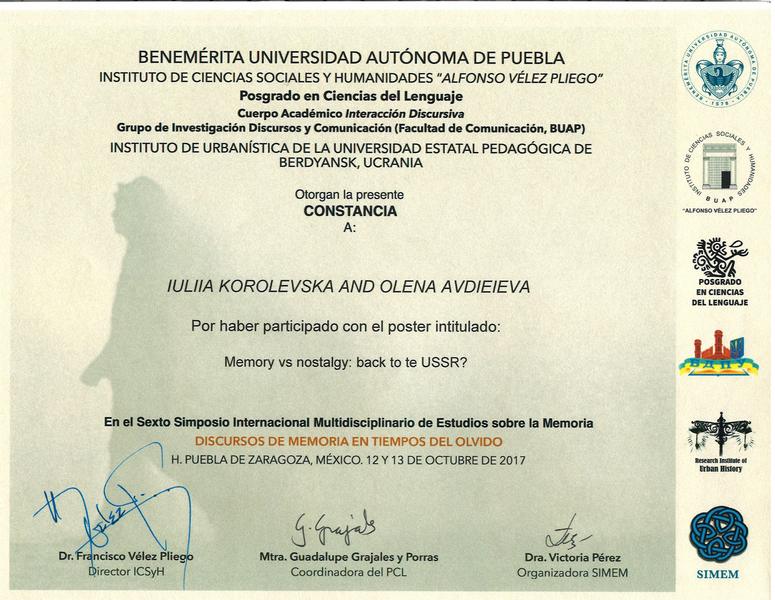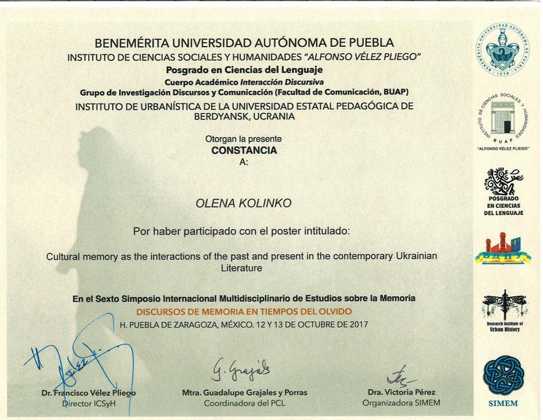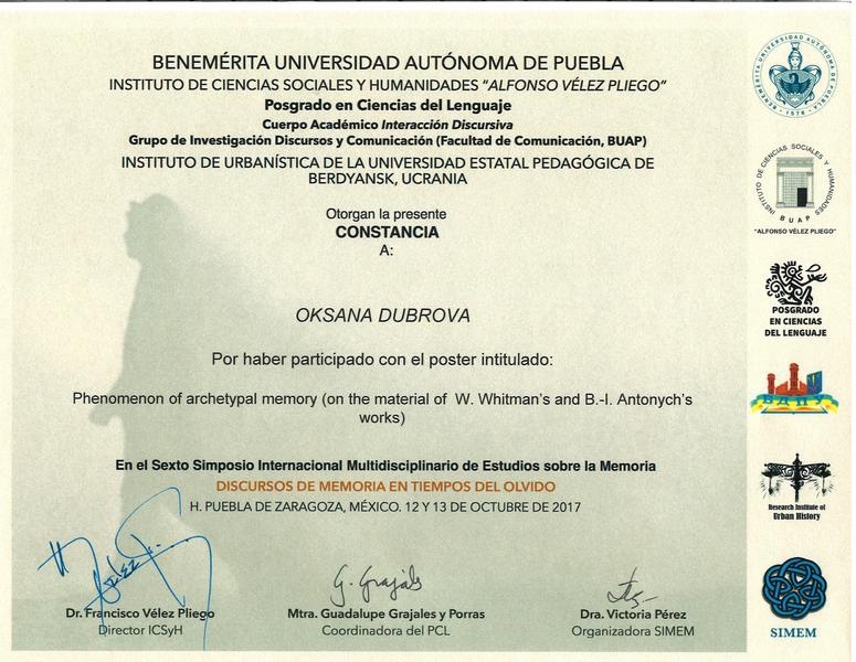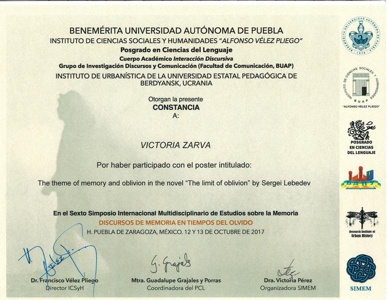 12-13 жовтня 2017 р. у Заслуженому Автономному Університеті Пуебла, який є ВНЗ-партнером БДПУ, відбувся вже шостий Міжнародний Симпозіум з Мультидисциплінарного Вивчення Пам’яті (SIMEM6). Цьогорічна тематика: «Дискурси пам’яті в часи забуття». Як і в попередні роки, ідейною натхненницею і організаторкою SIMEM стала доктор Вікторія Перес.