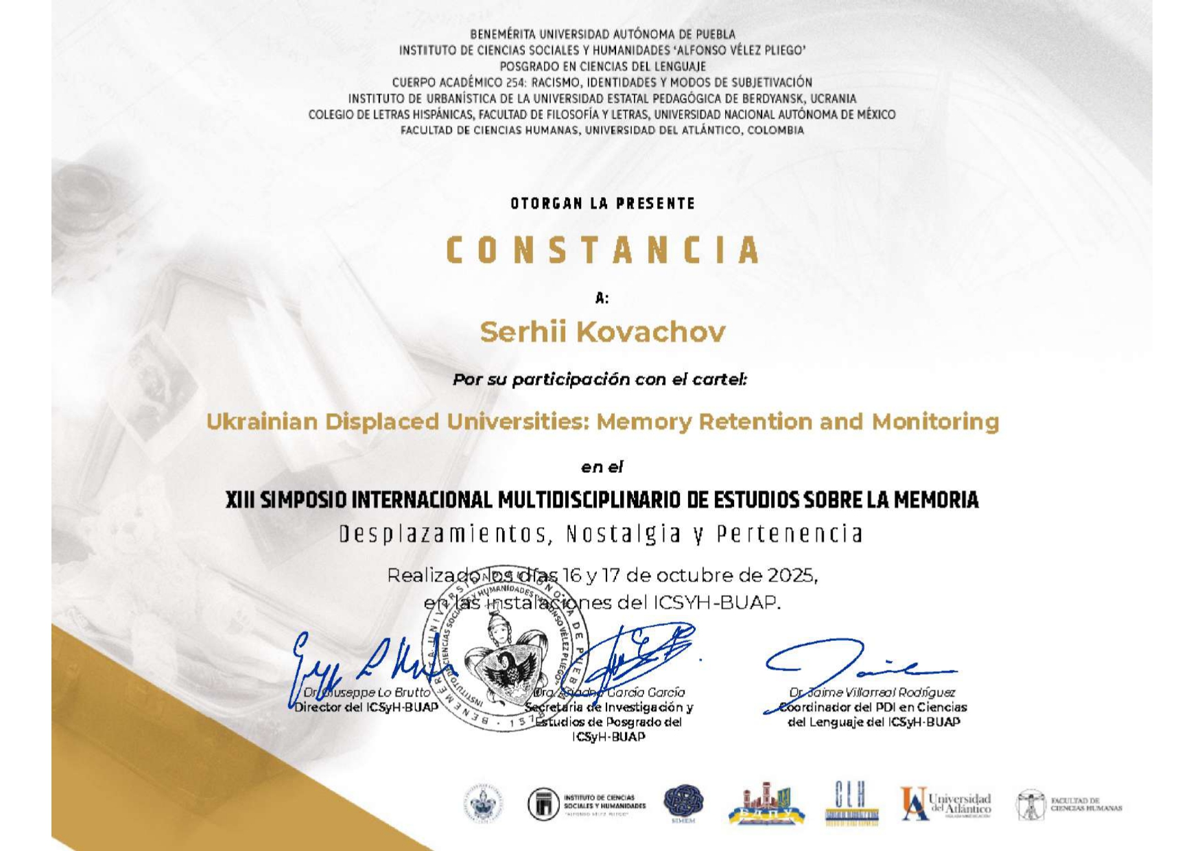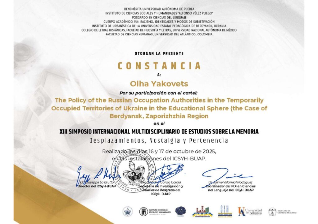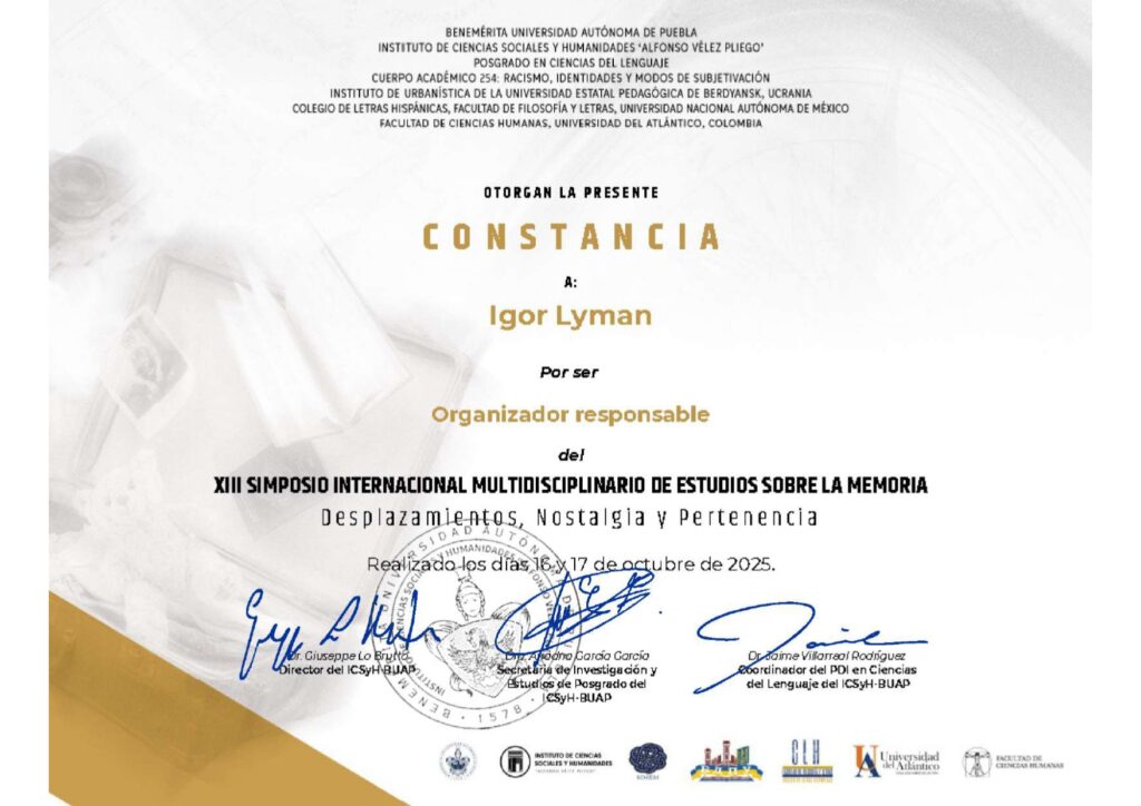 Цього року Інститут соціальних і гуманітарних наук “Альфонсо Велес Плієго” Заслуженого Автономного Університету Пуебла і Науково-дослідний інститут історичної урбаністики Бердянського державного педагогічного університету вже втринадцяте виступили співорганізаторами Міжнародного Симпозіуму з Мультидисциплінарного Вивчення Пам’яті (SIMEM ХІІІ), який відбувся у Мексиці.