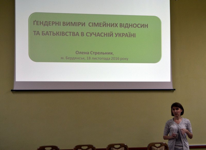 Другу частину семінару розпочала Олена Стрельник із лекцією «Гендерні виміри сімейних відносини та батьківства», де розкрила сутність сімейного інституту, сімейної політики та проблем балансування жінок між роботою та піклуванням про дітей.