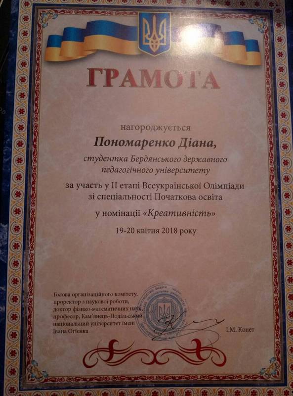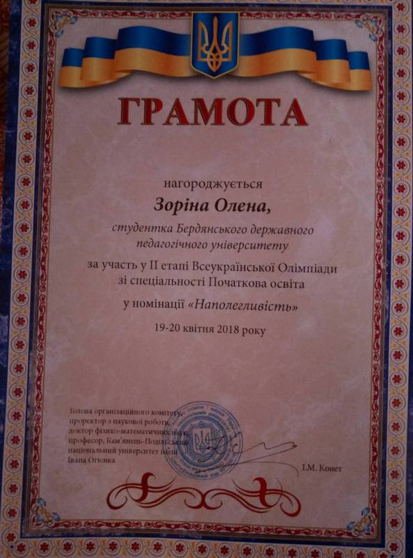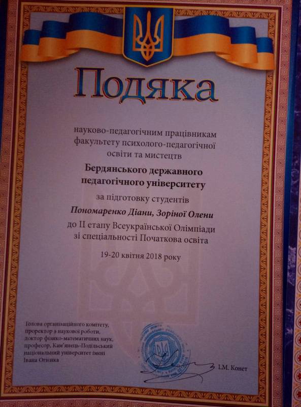 19–20 квітня 2018 року на базі Кам’янець-Подільського національного університету імені Івана Огієнка відбувся другий етап Всеукраїнської студентської олімпіади зі спеціальності «Початкова освіта». Наш університет представляли студентки факультету психолого-педагогічної освіти та мистецтв Пономаренко Діана та Зоріна Олена.