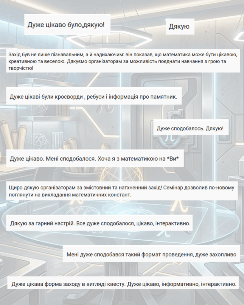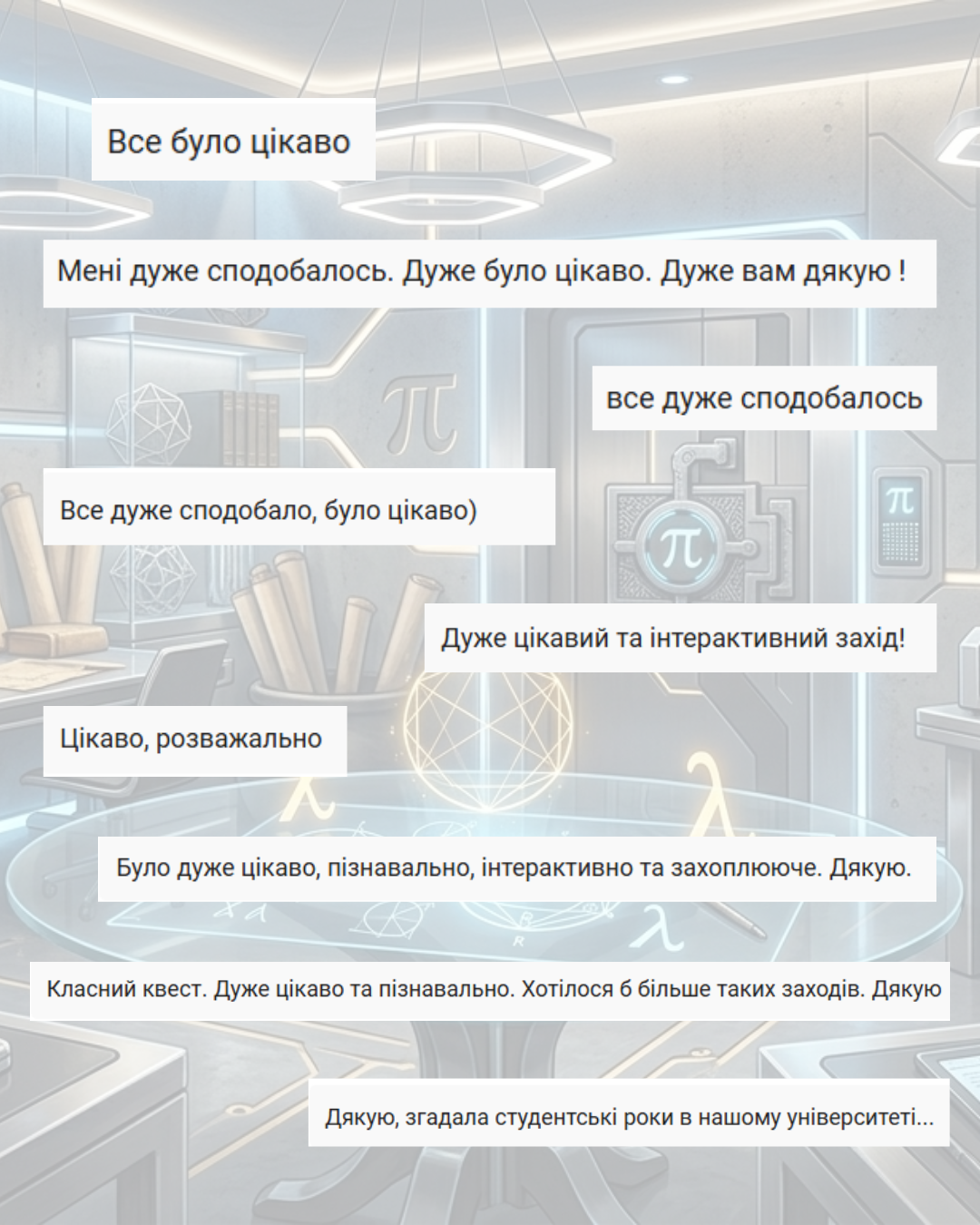 Розгадавши всі таємниці та зібравши частини коду, учасники успішно «вийшли» з лабораторії. Такі заходи вкотре демонструють, що завдяки креативному підходу математика відкривається як неймовірно цікава та жива наука, яка виходить далеко за межі звичайних підручників і формул. На завершення зустрічі було проведено інтерактивну рефлексію «Яке ти число Пі сьогодні?», під час якої здобувачі поділилися позитивними емоціями та натхненням.
