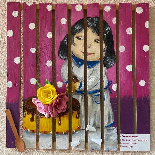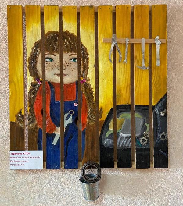 Ольга Рогозіна: Ми зробили виставку, присвячену трудовому навчанню та технологіям. І на цих картинах ми вирішили відобразити всі види технік та технологій, якими оволодівають наші студенти в процесі вивчення трудового навчання в майстерні. На першій картині – дівчина, яка працює за токарним верстатом, виготовляє ручку, на іншій картині – дівчина-автослюсарка з гаєчним ключем, з шестернями, інструментами: вона ремонтує автомобіль. Ще є дівчина-рукодільниця, яка вишиває, і дівчина-кухар з тортиком і всією кулінарною атрибутикою.