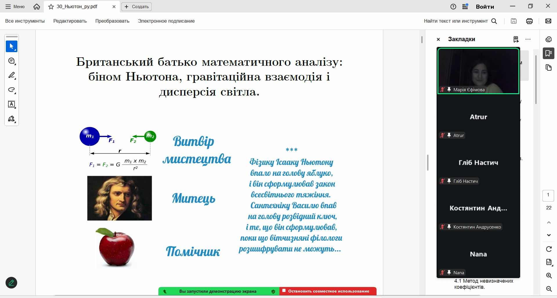 У черговий раз цього семестру в межах роботи математичного гуртка факультету ФМКТО БДПУ відбулося захопливе заняття у розширеному форматі, присвячене науковій спадщині Ісаака Ньютона – генія, який назавжди змінив наше розуміння Всесвіту. Учасники, серед яких було 5 запрошених учнів Бердянської гімназії «Лідер» разом із вчителем математики Єфімовою Марією Василівною, поринули у світ флюксій та механіки, де математичні формули пояснюють рух планет, падіння яблук і танець світлових променів.