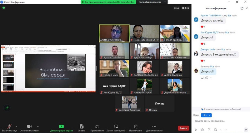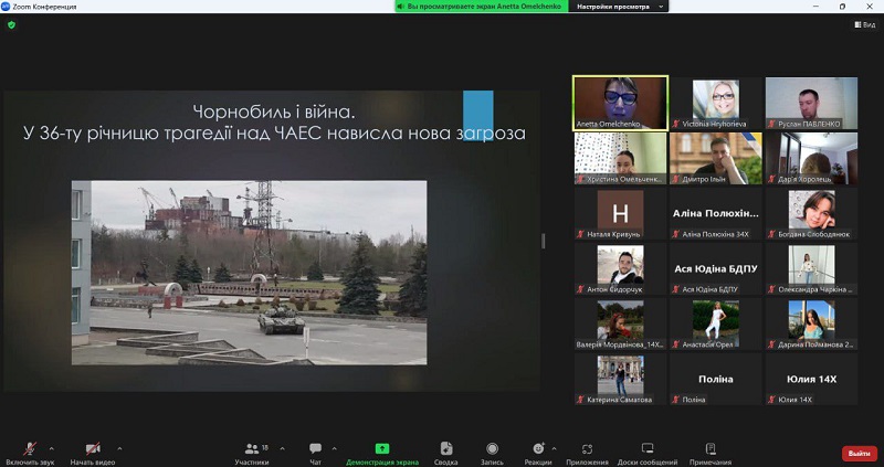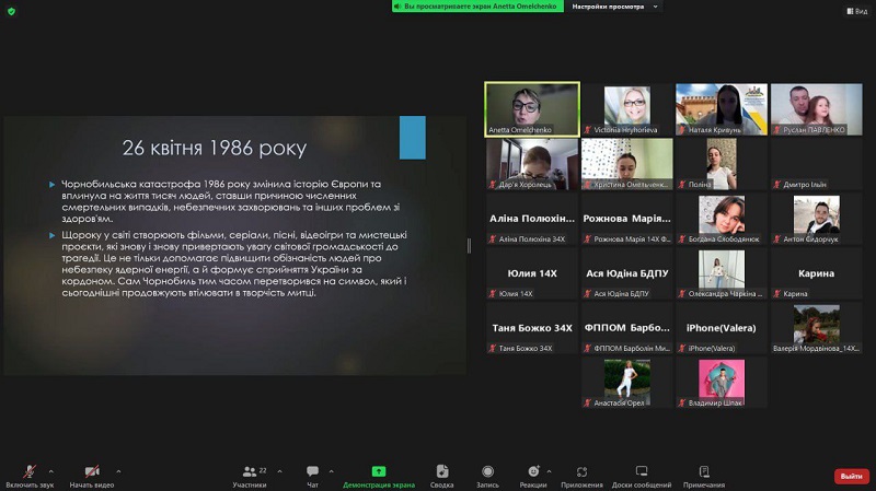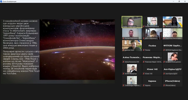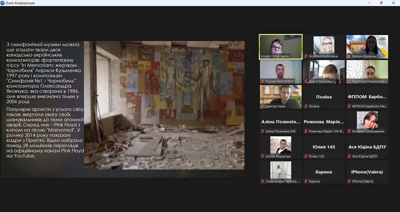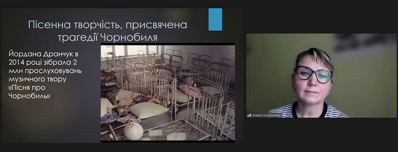 Напередодні 38-ї річниці з моменту техногенної ядерної катастрофи – аварії на Чорнобильській атомній електростанції – 23 квітня доценткою кафедри теорії та методики навчання мистецьких дисциплін Анеттою Омельченко було проведено виховну годину “Чорнобиль: біль серця” для здобувачів спеціальностей “Музичне мистецтво” і “Хореографія”. Пані Анетта розкрила трагічні події й наслідки Чорнобиля за допомогою мистецтва.