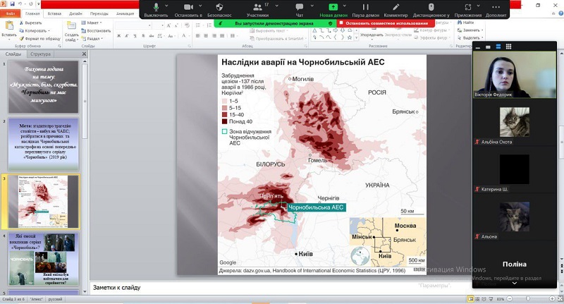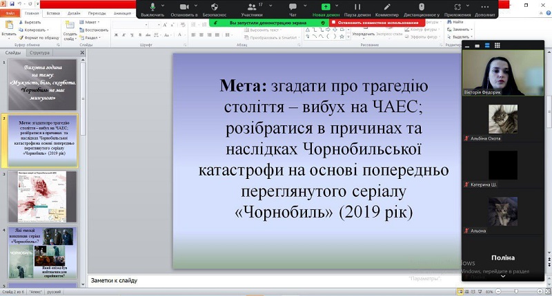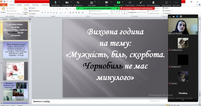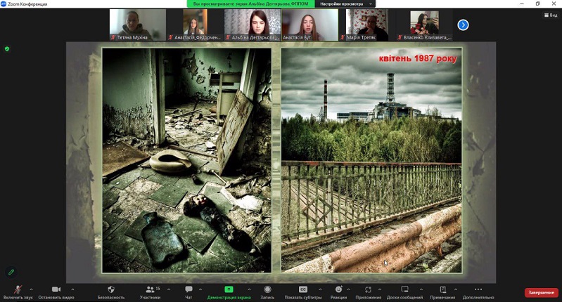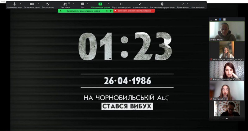 У моменти тиші та роздумів здобувачі вищої освіти 11ПО групи спільно з  куратором старшою викладачкою кафедри початкової освіти Тетяною Мухіною зібралися, щоб віддати шану та згадати трагедію, яка назавжди змінила нашу країну. Онлайн захід «Чорнобиль: біль та скорбота України» був не просто подорожжю в минуле, але й нагадуванням про відвагу та жертовність, які виявили герої нашої держави. Першокурсники мали можливість відкрити для себе сторінки історії, переглянувши презентацію, яку підготували Анастасія БУТ, Альбіна Дегтярьова та Анастасія Федорченко. Це дозволило не просто зануритись у події 1986 року, а й відчути важкість тих часів, коли життя українського народу поділилося на «до» і «після» пожежі на реакторі. Продекламований вірш «Чорнобильські дзвони» Марією Третяк викликав хвилю емоцій, нагадуючи про вічну боротьбу, втрату та надію… Хвилиною мовчання було вшановано пам’ять тих, хто пожертвував своїм життям, захищаючи нас від радіаційної загрози.