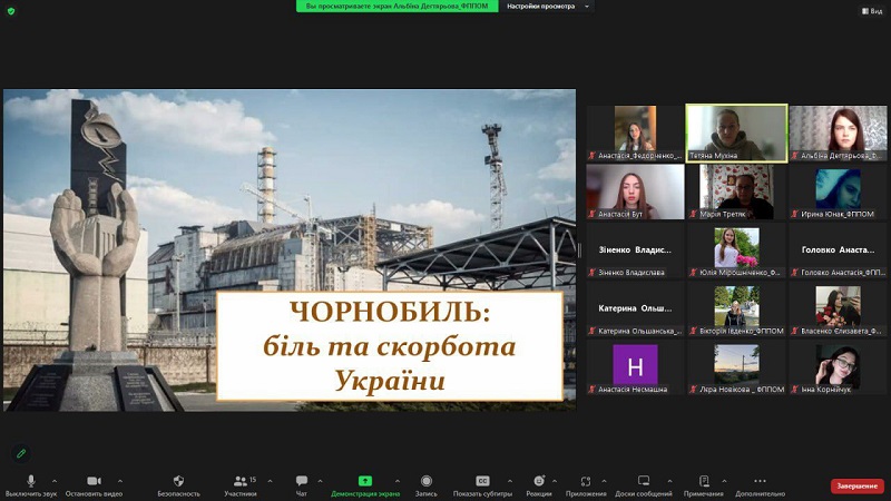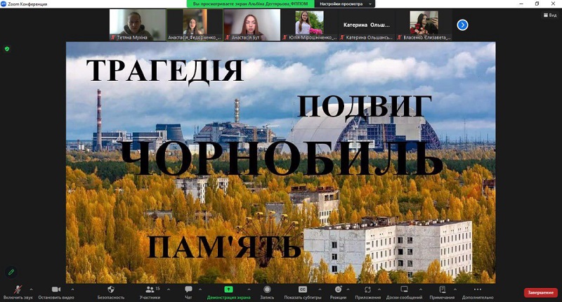 Кандидатка психологічних наук, доцентка Ірина Черезова і старша викладачка кафедри психології Вікторія Федорик (куратори 11П, 22П та 42П груп) провели виховну годину «Мужність, біль, скорбота. Чорнобиль не має минулого». Метою заходу було згадати про трагедію вибуху на ЧАЕС, розібратися в причинах та наслідках Чорнобильської катастрофи на основі попередньо переглянутого серіалу «Чорнобиль» (2019). По закінченню заходу викладачки разом зі здобувачами вищої освіти вшанували хвилиною мовчання пам’ять загиблих героїв.