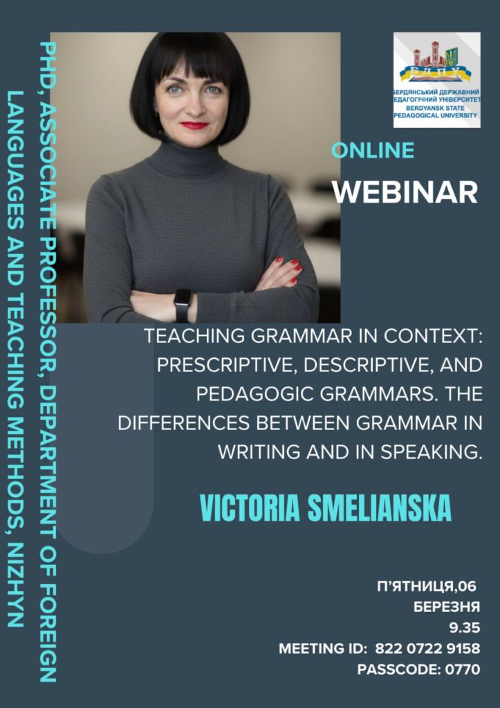 6 березня 2025 року на соціально-гуманітарному факультеті БДПУ відбулась онлайн-лекція «Teaching Grammar in Context: Prescriptive, Descriptive, and Pedagogic Grammars. The Differences Between Grammar in Writing and in Speaking».