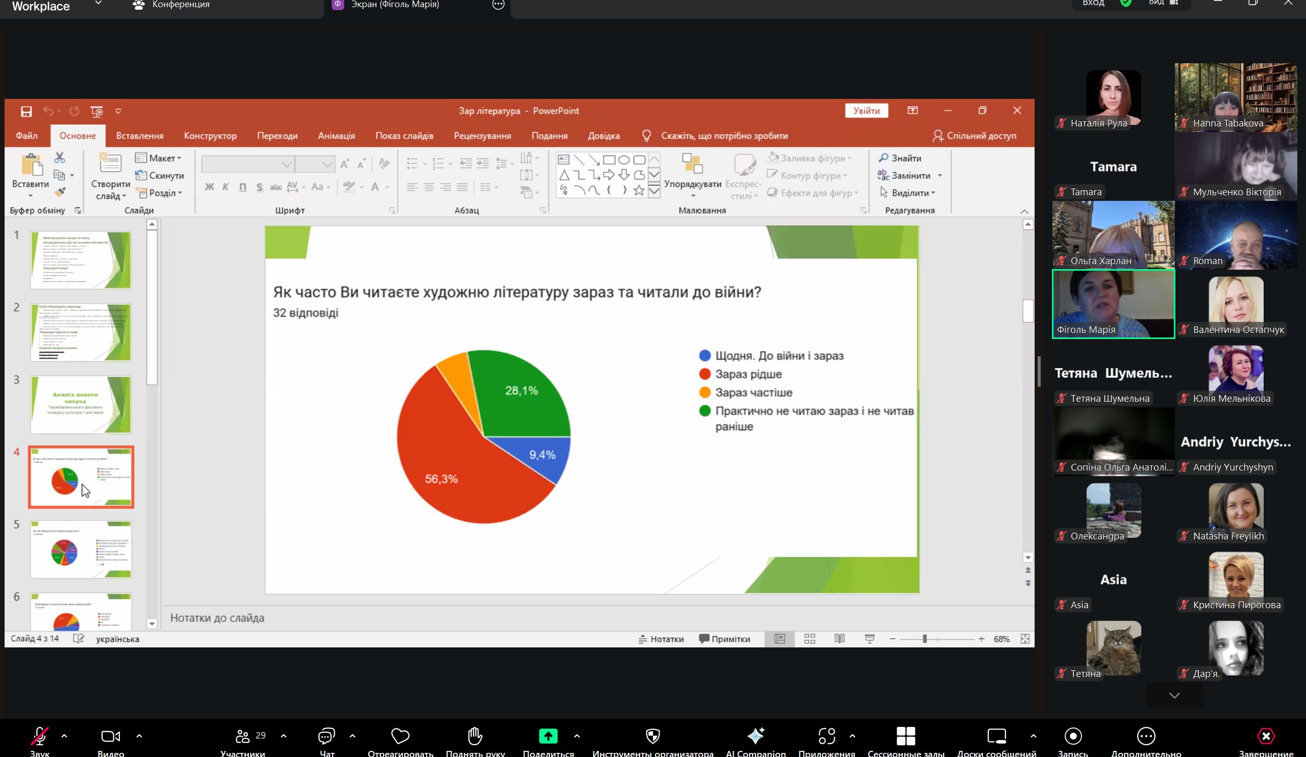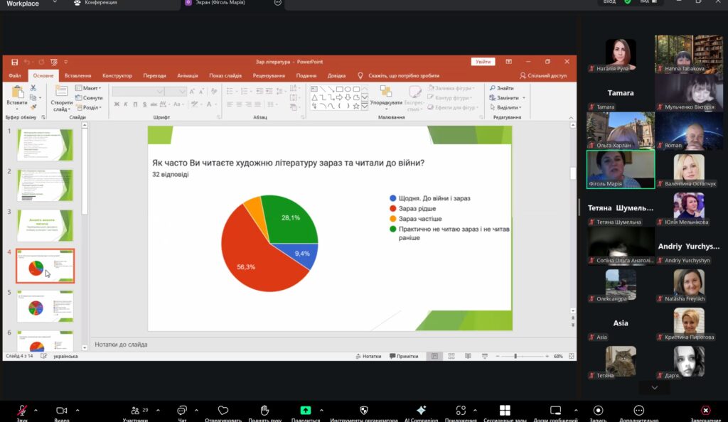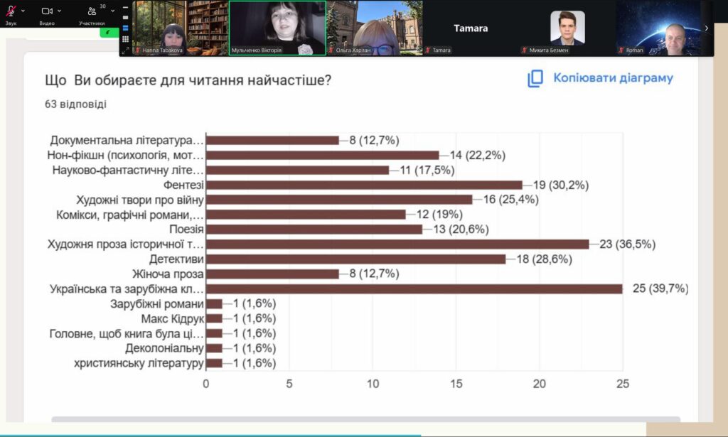 У своїх доповідях студентки висвітлили статистичні дані, зібрані під час опитувань респондентів різних вікових груп. Зокрема, дослідження показало, що понад половина опитаних українців (55%) читає щотижня, а серед найбільш популярних жанрів лідирують фантастика (35%), нон-фікшн (25%) та психологічна проза (20%). Було також відзначено, що електронні книги (45%) зрівнялися за популярністю з друкованими (45%), а ключовим фактором впливу на вибір залишаються рекомендації друзів та книжкових блогерів (40%). Студентки проаналізували найбільш популярні жанри, вплив соціальних мереж на вибір книжок, а також роль медіа, культурних подій та цифрових платформ у промоції читання. Значна увага була приділена тому, як культурні виклики сьогодення змінюють запити аудиторії й стимулюють розвиток нових форматів літературної комунікації.