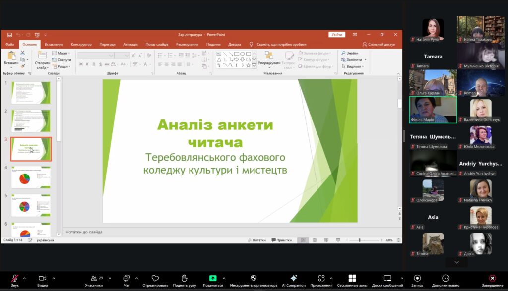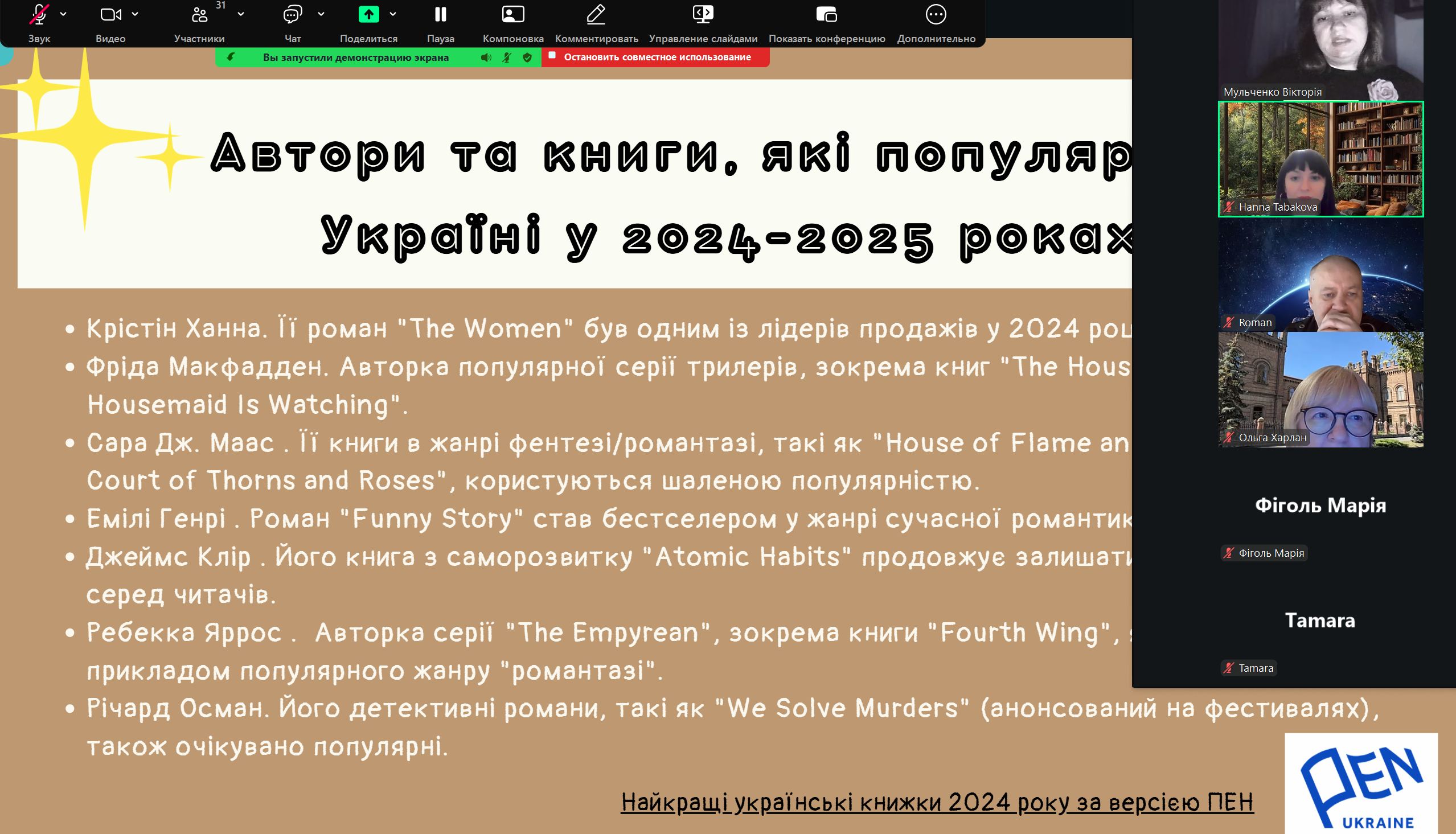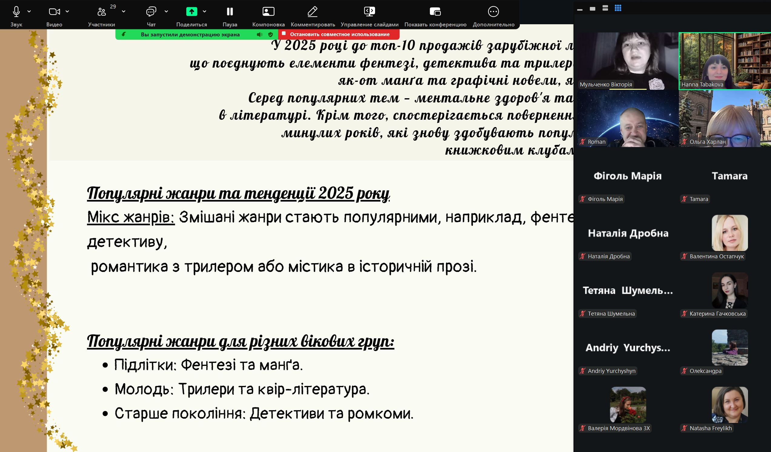25 листопада 2025 року в межах навчального процесу Бердянського державного педагогічного університету відбувся вебінар «Що читають українці», організований викладачами і здобувачами освітньо-наукової програми «Літературно-мистецький менеджмент». Першокурсниці магістратури Марія Фіголь та Вікторія Мульченко презентували перші результати власного дослідницького проєкту, присвяченого сучасним читацьким практикам в Україні, динаміці літературних вподобань та факторам, що формують інтереси читачів у довоєнний час та сьогодні.