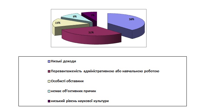 На поставлене питання з 106 опитаних 38% вважають основною проблемою низьку заробітну платню та інші виплати, 31% називають основною перешкодою наукової діяльності перевантаженість адміністративною та навчальною роботою. Багатьма респондентами відмічається надмірно висока аудиторна завантаженість викладача. Дійсно, що при порушенні балансу навантаження з різних видів робіт (наукової, виховної, навчальної, методичної, суспільної) молодим ученим доводиться обмежувати наукову роботу на користь інших видів робот. Негативно позначається і низький рівень доходів, в наслідок чого молоді учені-викладачі вимушені працювати за сумісництвом, що в значній мірі скорочує часові ресурси, що необхідні для наукової діяльності. Еще 15% викладачів вважають, що науці перешкоджають різні особистісні мотивації, серед яких називаються: сімейні проблеми, недостатня мотивація, відсутність інтересу до науки и т.п. 9% опитаних вважають, що об’єктивних перешкод для наукової активності не існує. При цьому на питання що сприяє науковій роботі, 72% респондентів відмічають матеріальні заохочення та (або) кар’єру, а 19% опитаних називають перспективу кар’єрного зростання. И тільки 6% опитаних вважають, що активізують наукову роботу молодого ученого інші мотивації, в тому числі сприятливе ставлення керівництва, формування наукових шкіл та інше.
