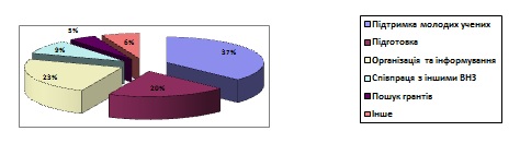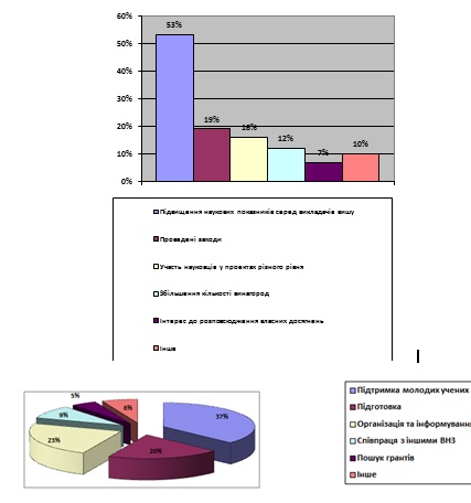 На питання «Які, на ваш погляд, найбільш ефективні форми підтримки молодого вченого можуть бути застосовані у ВНЗ?» переважна більшість опитаних вказують на фінансову підтримку (72%). Таким чином, основним мотиватором наукової діяльності виступає фінансовий інтерес молодих вчених.
