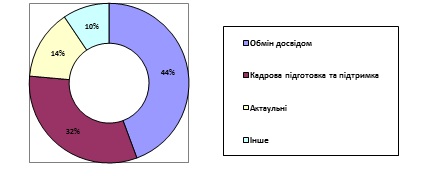 Більшість респондентів (45%) відмітили, що основними питаннями, що мають розглядатись під час засідання РМУ мають бути щодо обміну досвідом зокрема між Вишами, або між ученими різних регіонів України та інших країн. 32% опитаних вважають, що кадрова підготовка молодих науковців є першочерговим завданням, що має бути розглянутим під час засідань РМУ. 14% відзначили до розгляду нагальні актуальні питання, що виникають протягом року, зокрема пошук шляхів ефективної комунікації між вченими та суспільством, між вченими та владою тощо.