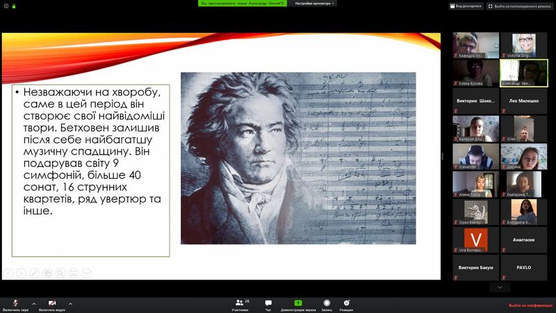 В онлайн конкурсі презентацій взяли участь студенти І курсу І рівня вищої освіти під керівництвом доцентки Анетти ОМЕЛЬЧЕНКО. Презентації були присвячені творчості композиторів-класиків та композиторів-романтиків західноєвропейської школи. Найкращою стала презентація Олександра ЄВІНА «Останній титан класицизму (Людвіг ван Бетховен)».