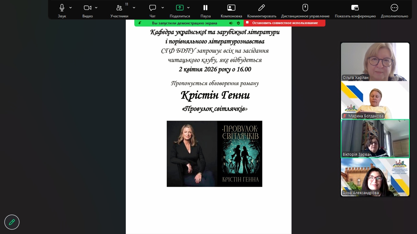 Засідання читацького клубу, присвячене обговоренню роману Крістін Генни «Провулок світлячків»(2008, 2024 – український переклад Таїсії Івченко), яке відбулося 2 квітня 2026 р., стало подією, що об’єднала студентів та викладачів навколо глибокого й емоційного осмислення сучасної зарубіжної прози. Твір викликав жвавий інтерес завдяки поєднанню захопливого сюжету, психологічної насиченості та актуальної проблематики.