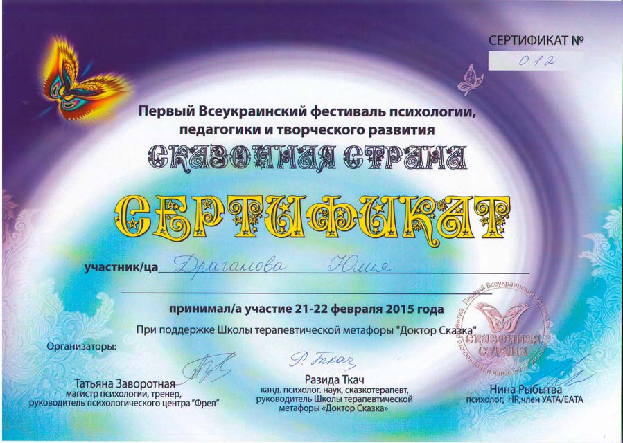 Саме тому викладачі канд. психол. наук, ст. викл. О. Сербова та ас. Ю. Драганова стали учасниками І Всеукраїнського психологічного фестивалю «Казкова країна», що проходив у Києві 21 та 22 лютого 2015 року. На фестивалі були представлені різні психологічні напрями та течії: сімейна та дитяча психологія, казкотерапія, арт-терапія, травма терапія, ігрова терапія, піскова терапія, метафоричні асоціативні карти тощо. Наші викладачі відвідали цілу низку майстер-класів: «Казка про дитину» (Р. Ткач), «Конфлікти дітей та батьків: причини та шляхи вирішення» (Т. Фролова), «Терапевтична метафора «Ти – дурень»» (Є. Тичковський), «Плюс і Мінус»» (Р. Ярощук), «Практичне дитинознавство» (С. Ройз) та інші.