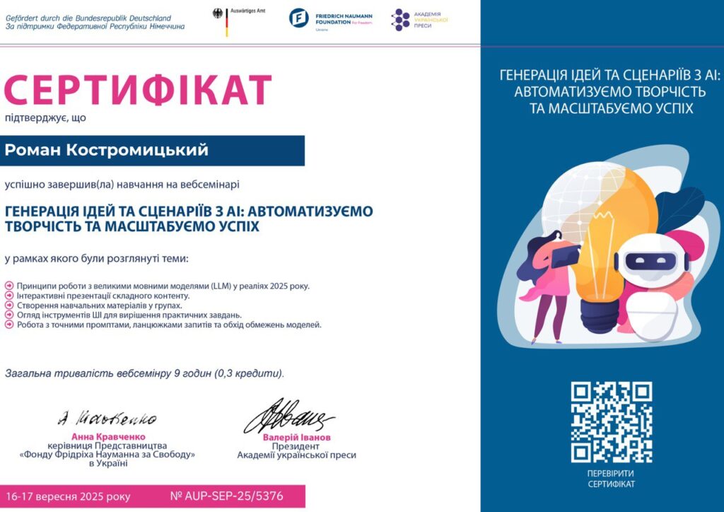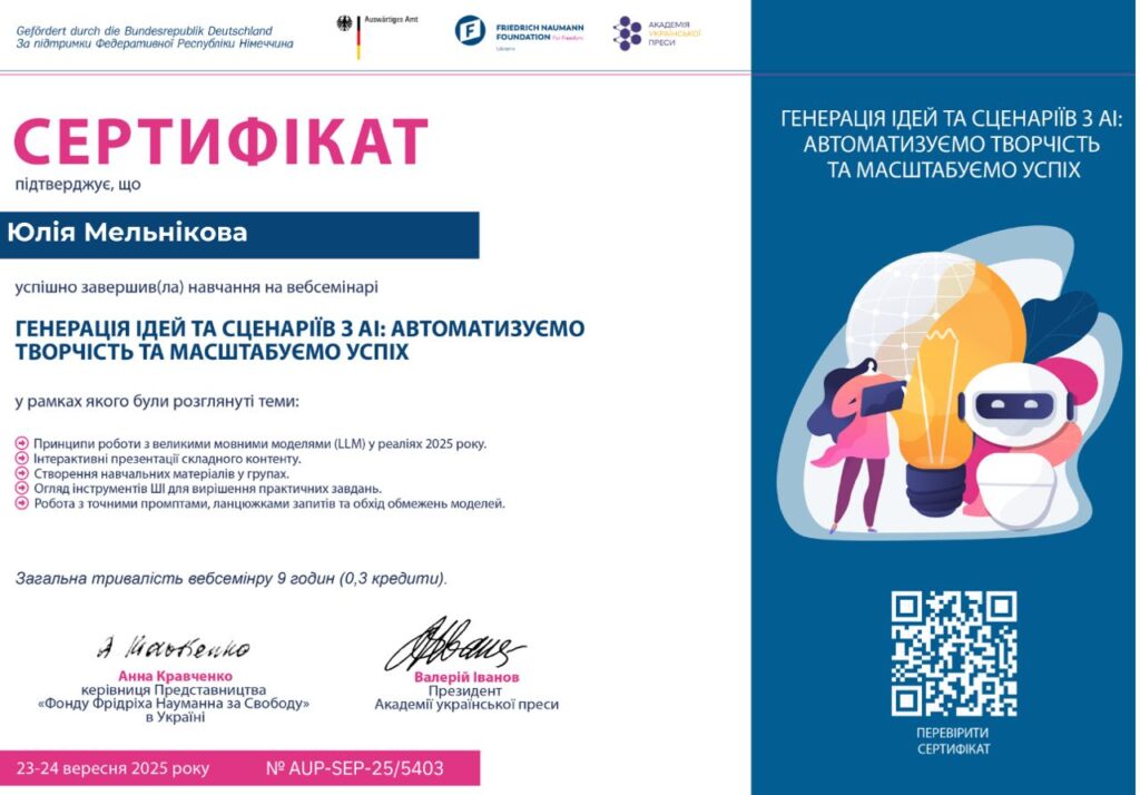 In September and early October, the Academy of Ukrainian Press, with the support of the Friedrich Naumann Foundation for Freedom in Ukraine, organized a webinar titled “Idea and Script Generation with AI: Automating Creativity and Scaling Success.” Lecturers of the Department of Ukrainian Language and Journalism at Berdyansk State Pedagogical University – Roman Kostromytskyi, Yuliia Melnikova, Nataliia Rula, and Anzhelika Shulzhenko – took part in the training and received certificates of completion.