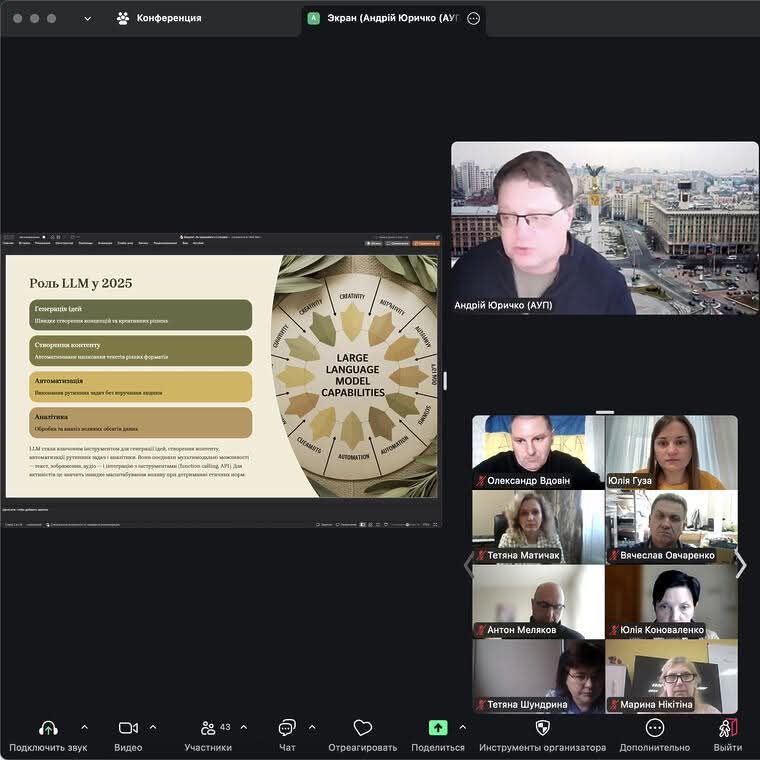 During the engaging online sessions, participants explored new opportunities for integrating artificial intelligence into educational and creative practices. The speakers shared practical advice on using AI tools for media content creation, script development, and enhancing creative processes in journalism education. In particular, they discussed the principles of working with large language models (LLMs) in the realities of 2025, demonstrated interactive presentations of complex content, collaborated in groups to create educational materials, examined AI tools for solving practical tasks, and learned how to craft effective prompts, build prompt chains, and overcome model limitations.