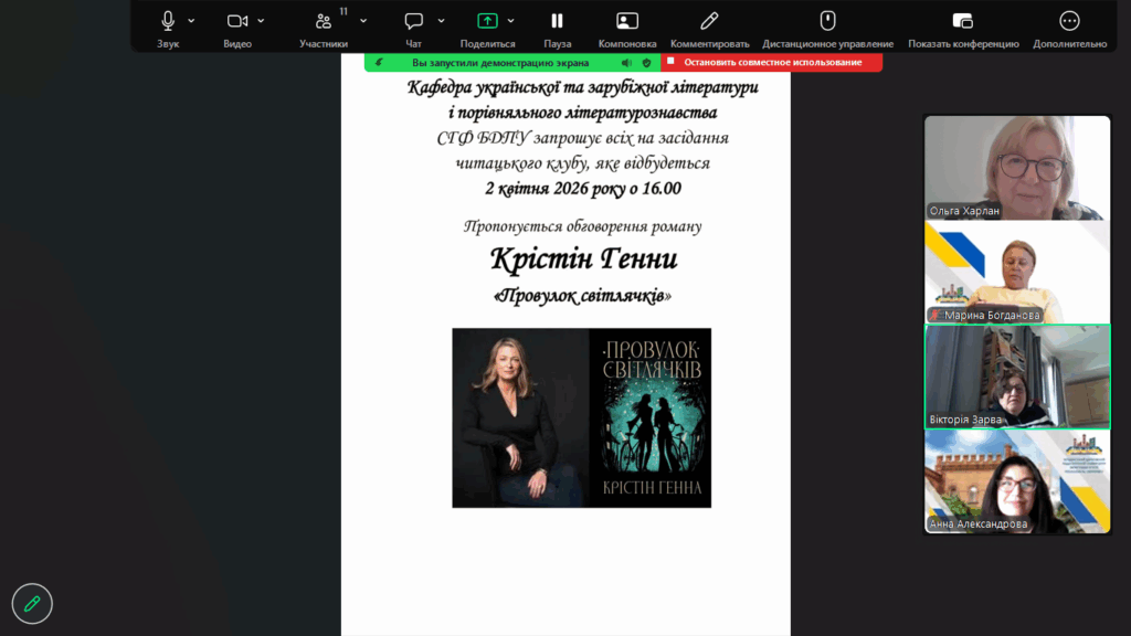 The meeting of the reading club, dedicated to discussing Kristin Hannah’s novel “Firefly Lane” (2008; Ukrainian translation by Taisiia Ivchenko, 2024), held on April 2, 2026, became an event that brought together students and lecturers for a deep and emotional reflection on contemporary foreign prose. The work sparked lively interest due to its combination of an engaging plot, psychological depth, and актуальні themes.