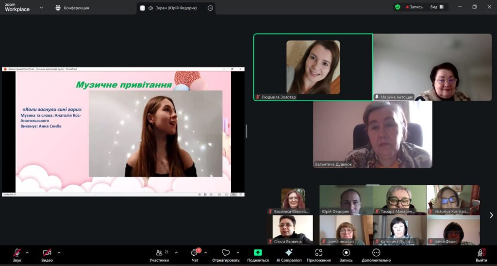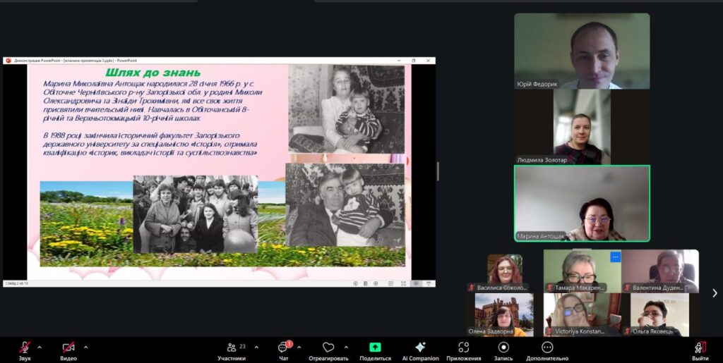 The format of the event combined a visual presentation with musical and video greetings and live interaction. Through photographs and brief commentaries, participants were able to trace the main stages of Maryna Antoshchak’s life and professional career – from her childhood and school years, through her work as a history teacher at Secondary School No. 16 in Berdyansk, to her many years of productive activity at the Department of History and Philosophy of BSPU.