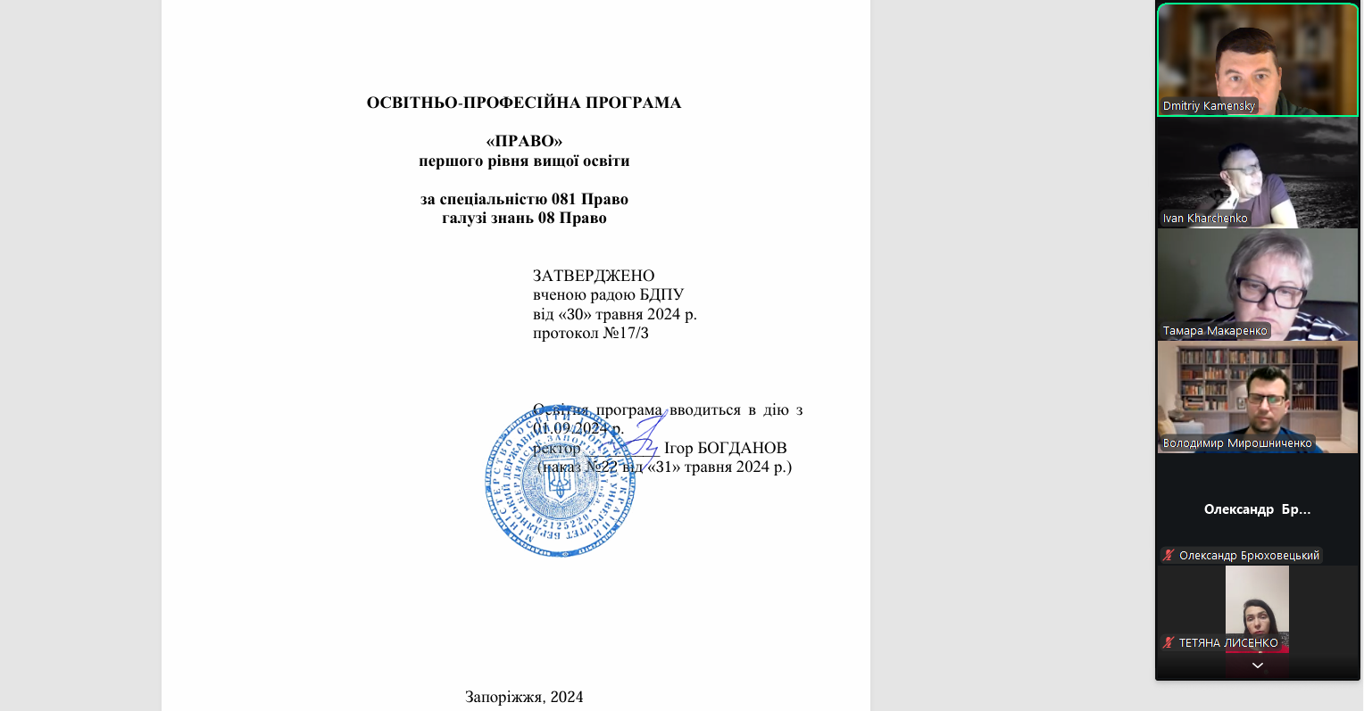 On March 27, 2026, a meeting of the working group was held to discuss proposals and feedback from stakeholders of Berdyansk State Pedagogical University regarding the educational and professional programs (EPP) in specialty 081 “Law” (First/Bachelor’s and Second/Master’s levels of higher education).