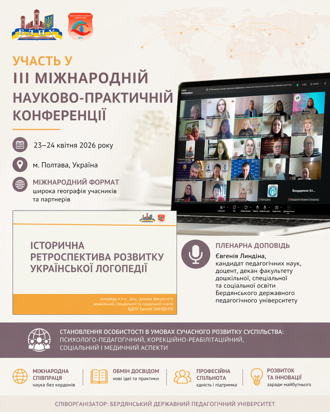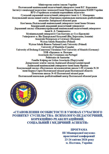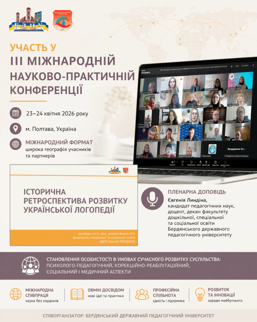 Within the framework of cooperation with Poltava V. G. Korolenko National Pedagogical University, representatives of Berdiansk State Pedagogical University took part in the III International Scientific and Practical Conference “Personality Formation in the Context of Contemporary Societal Development: Psychological, Pedagogical, Correctional and Rehabilitation, Social and Medical Aspects”, held on April 23, 2026. Berdiansk State Pedagogical University acted as a co-organizer of the event.