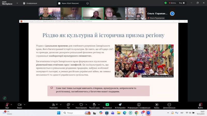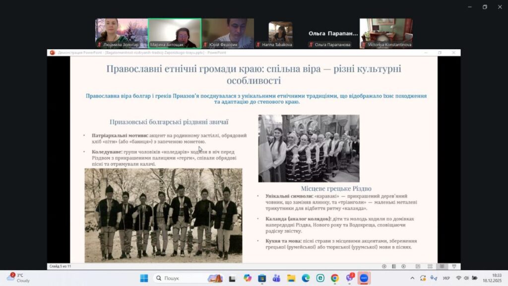 On 18 December 2025, the Department of History and Philosophy held an open online lecture dedicated to exploring the unique cultural landscape of our region through the prism of Christmas holidays. The event became an important platform for discussing the multiculturalism of the Zaporizhzhia region as a “laboratory of cultural coexistence”, where the traditions of different ethnic groups and confessions have intertwined over the centuries.