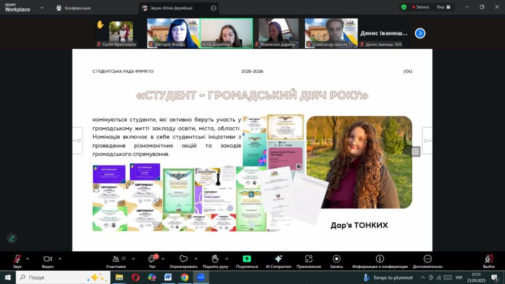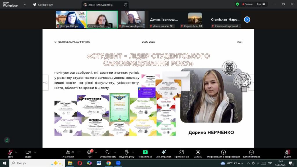 Daryna NEMCHENKO, a second-level (Master’s) degree student of groups m2ts and m2ma, was recognized as the best in the nomination «Student Public Figure of the Year».