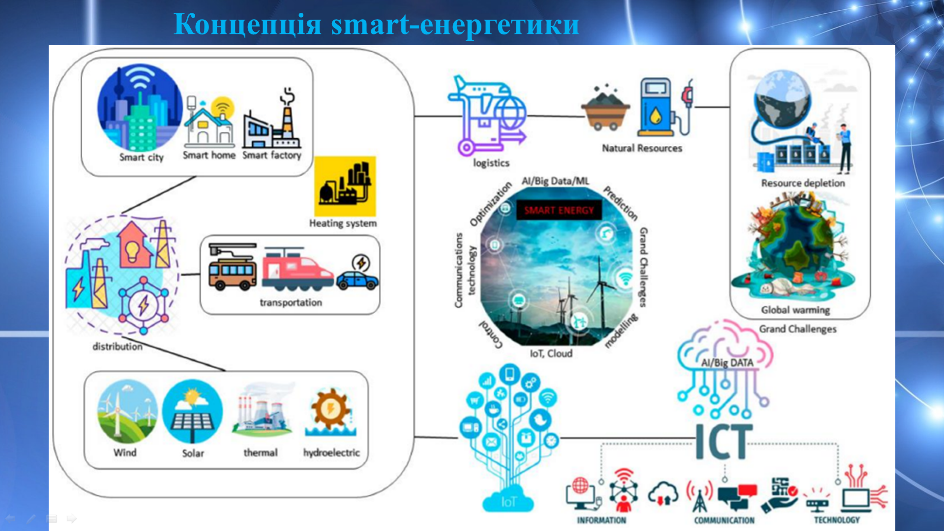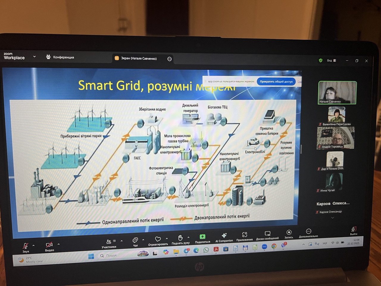 У розрізі теми лекторкою схарактеризовано стан енергетичної системи в Україні, базові положення щодо енергетичного потенціалу відновлюваних енергоресурсів. Також розглядались питання енергетичного переходу від викопних джерел енергії на користь екологічно чистої альтернативної енергетики. Надзвичайно цікаво та змістовно лекторка розповіла про принципи побудови сучасних енергосистем, а саме про впровадження «розумних електричних мереж» Smart Grid, як ключової технології об’єднання розподіленої генерації у енергосистемі.
