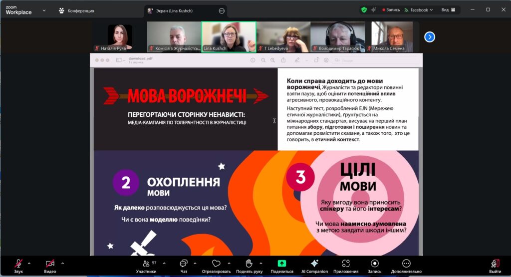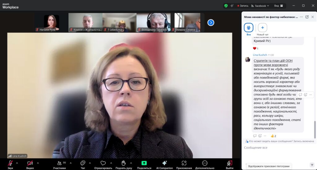 1. Як «ловити» мову ворожнечі на ранньому етапі: методологія розпізнавання (спікерка – Ліна Кущ, членкиня КЖЕ, перша секретарка Національної спілки журналістів України).