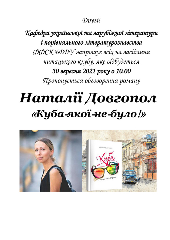 Запрошуємо усіх зацікавлених приєднатися до наших зібрань, які відбуваються кожного останнього четверга місяця. До наступного засідання читаємо роман Наталії Довгопол «Куба-якої-не-було!».