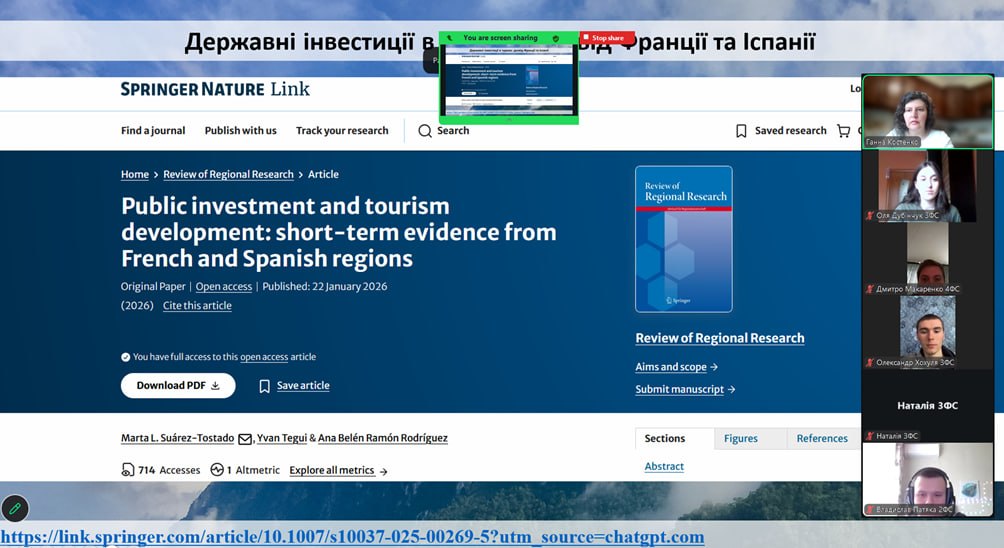 31 березня 2026 року відбулося чергове засідання наукового гуртка «Сучасні проблеми економіки та фінансів» для здобувачів освітньо-професійних програм «Фінанси, банківська справа та страхування» та «Економіка бізнесу», присвячене фінансам та інвестиціям у рекреаційній сфері. Це викликало значний інтерес та сприяло активній науковій дискусії. Засідання провела керівник гуртка – к.е.н., доцент кафедри економіки, менеджменту та фінансів Костенко Г. П.