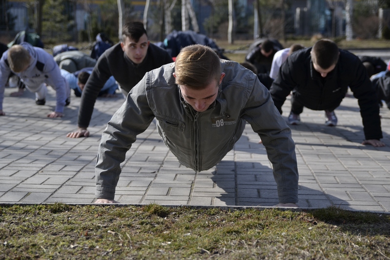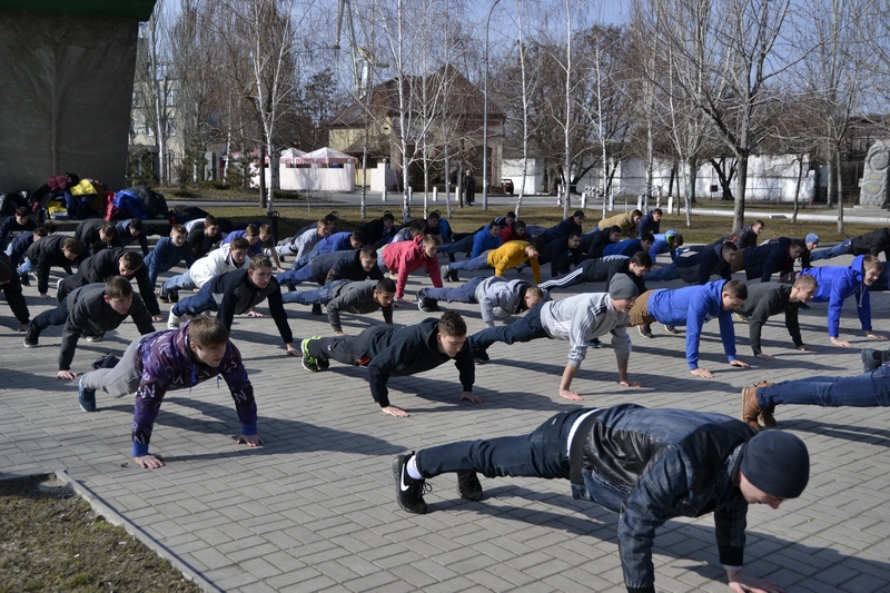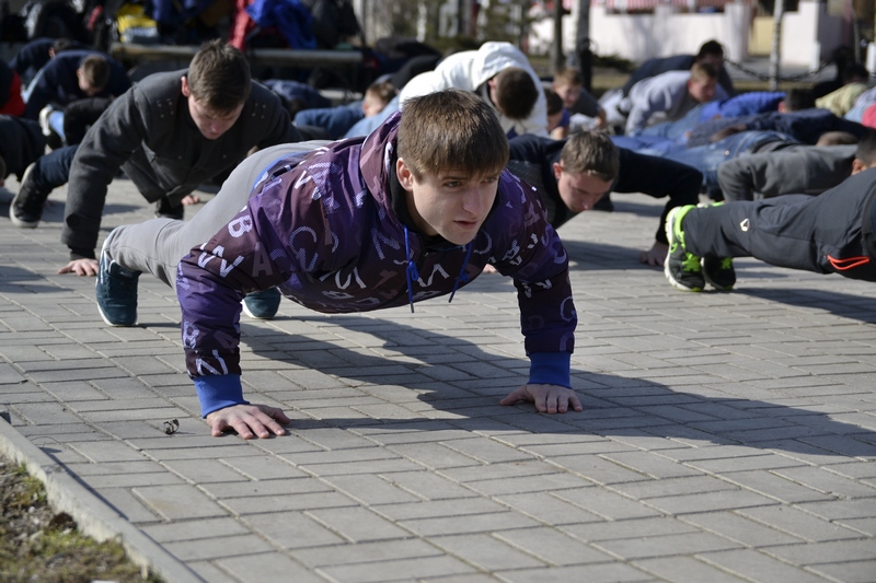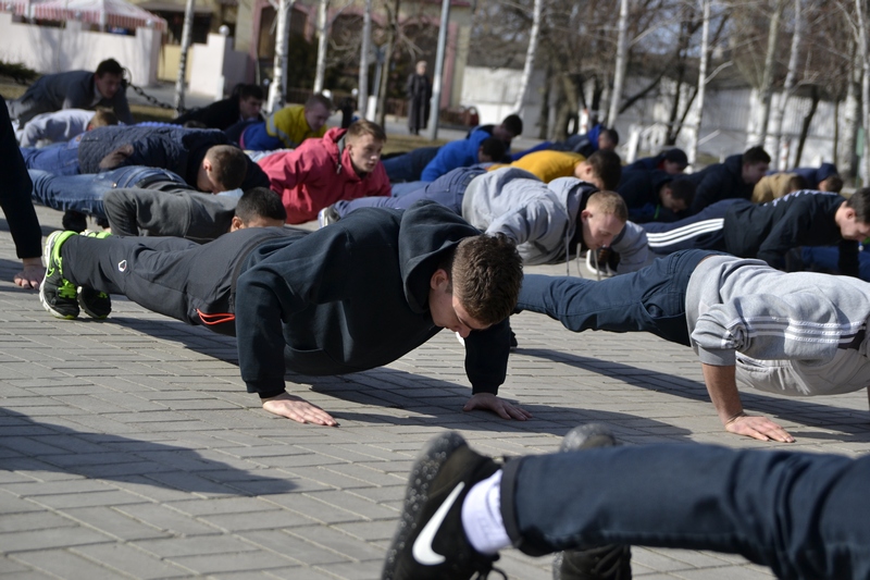 Сьогодні, 7 березня, напередодні завтрашнього чистого, теплого свята, студенти та викладачі факультету фізичного виховання вирішили по-своєму зворушити університетське жіноцтво, організувавши чоловічий флешмоб багаторазового віджимання від землі на свіжому повітрі. 110 учасників (в основному студентів факультету) під музичний супровід продемонстрували 2200 віджимань!