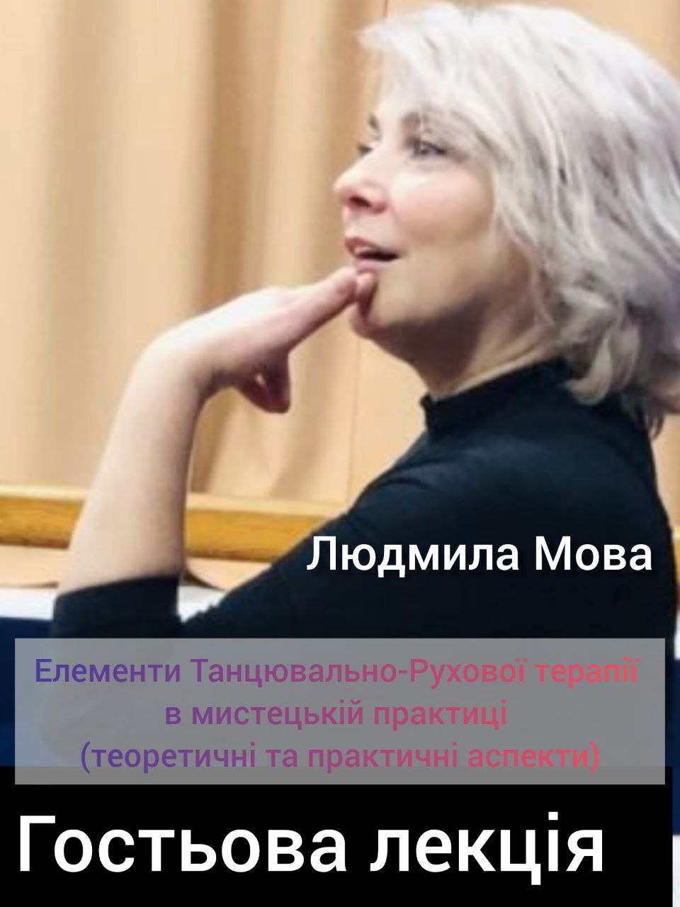 17 лютого 2026 року на кафедрі хореографії та фітнесу відбулася гостьова лекція на тему «Елементи Танцювально-Рухової терапії в мистецький практиці (теоретичні та практичні аспекти)» від докторки педагогогічних наук, професорки кафедри хореографії Київської муніципальної академії естрадного та циркового мистецтва Людмили Мови. Це стало для викладачів та здобувачів вищої освіти важливим кроком до усвідомленого й професійно відповідального використання цього напряму в мистецькому середовищі.