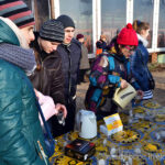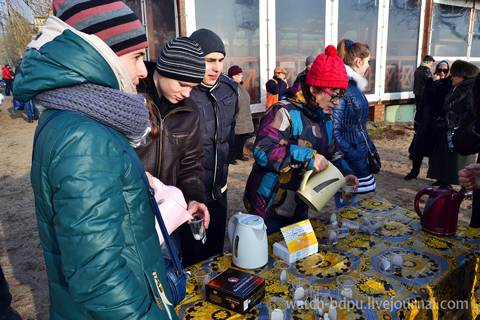 Згодом виглянуло сонце. З теплою погодою повернувся й відповідний настрій. Усім бажаючим натурально зігрітися викладачі та студенти БДПУ роздавали гарячий чай (див. світлини). Було помічено багато справді теплих моментів. Багато людей зустріли своїх знайомих, з якими були раді побачитися. При мені одна літня пара зробила свій перший сімейний знімок. Чоловік сказав дружині : “Тепер спільне фото маємо.” Сонце відбивалося у морі, даючи йому золотого відтінку. Довкола літали чайки, віяло запахом ладану – чи не схоже на диво? Люди прийшли сюди з однією метою – наповнити пляшки святою водою, а душу – вірою.