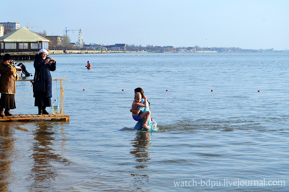 Як і годиться, під час дійства буди присутні: швидка допомога, рятувальники, міліціонери та водолази. Але, на щастя, допомога нікому не знадобилася. Усі, що пірнали в воду, виходили на берег усміхненими та збудженими. Зауважу, що серед “пірнальників” були не тільки чоловіки. Жінки теж не побоялися низької температури води. Було багато й молоді, яка прийшла “очиститися” (див. світлини). Це приємно здивувало людей похилого віку – бабусі все повторювали : “Поглянь – скільки молодих прийшло”. Знайшлися сміливці й серед дітей, яких матері заносили в воду на руках. За кількістю сфотографованих усміхнених облич цей день є другим після Нового року. Хтось робив купання за правилами – тричі пірнав і хрестився, дехто забігав у море та швиденько повертав з холодної водиці, поспішаючи за рушником, але всіх цих людей об’єднала віра, що доводить наявність духовності у бердянців.