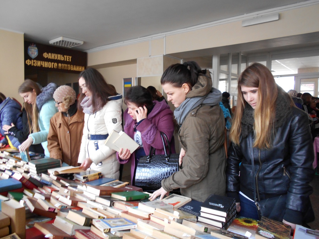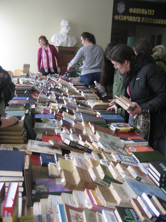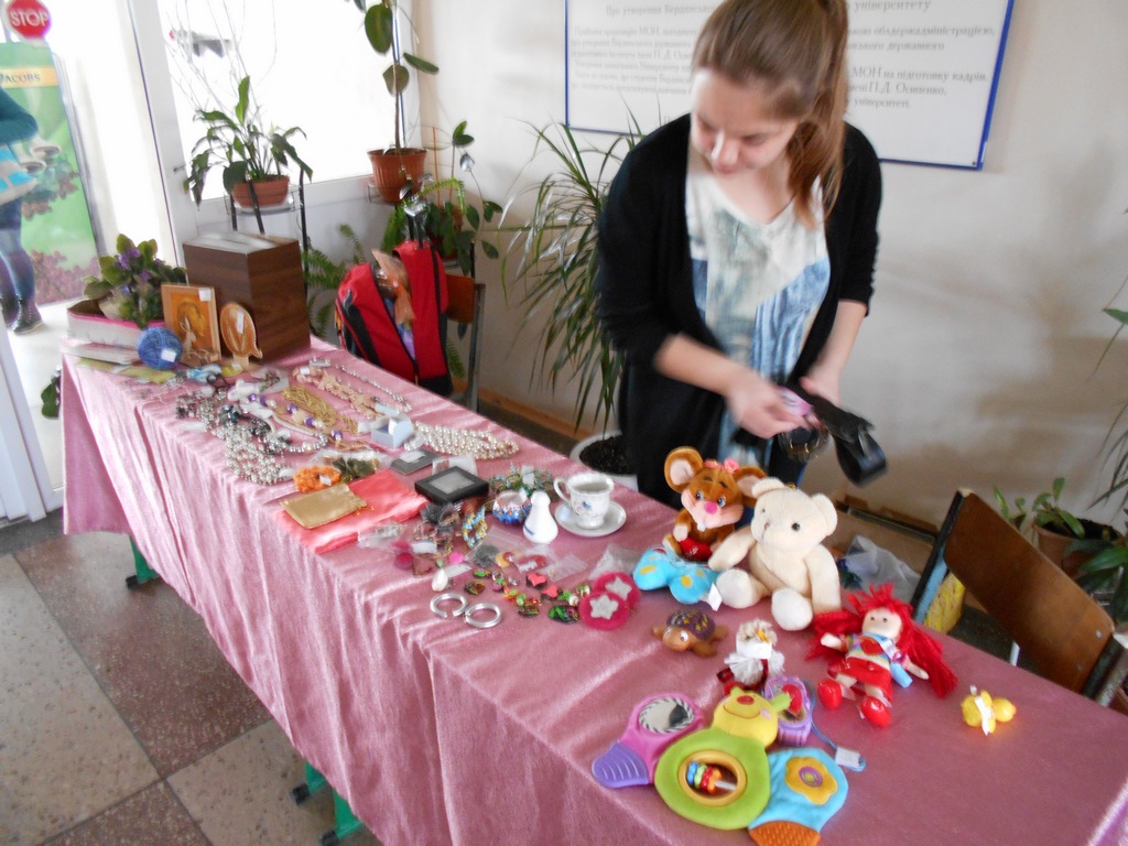…Щойно в фойє 5-го університетського корпусу завершився черговий, 13-ий Благодійний книжковий (і не тільки) ярмарок. Відвідувачі традиційно мали змогу придбати не лише цікаві книги, а й біжутерію, канцтовари, навіть, квіти. Цього разу до ярмаркового дійства активно долучилася й Благодійна Скриня «ДоброДій» БДПУ, представники якої виставили на продаж, отримані від своїх американських друзів (церква св. Івана Хрестителя з м. Нюарку та засновниця Фонду ім. К. Ковшевич – пані Христина Ковшевич-Дурбак) чимало видів різного краму.