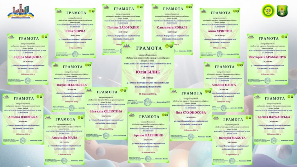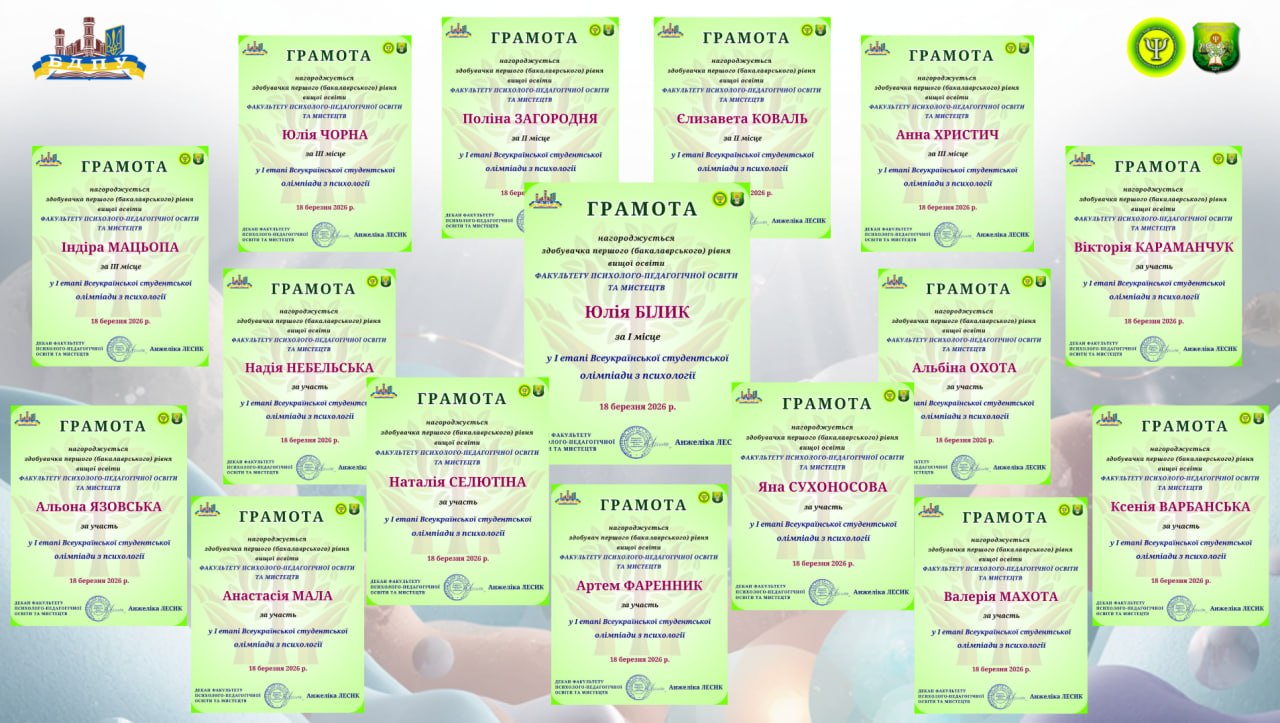 За результатами проведення І етапу Всеукраїнської студентської олімпіади з психології І місце здобула третьокурсниця Юлія Білик, ІІ місце посіли здобувачки 4 курсу Поліна Загородня та Єлизавета Коваль, ІІІ місце вибороли Анна Христич (2 курс), Юлія Чорна (2 курс), Індіра Мацьопа (3 курс).