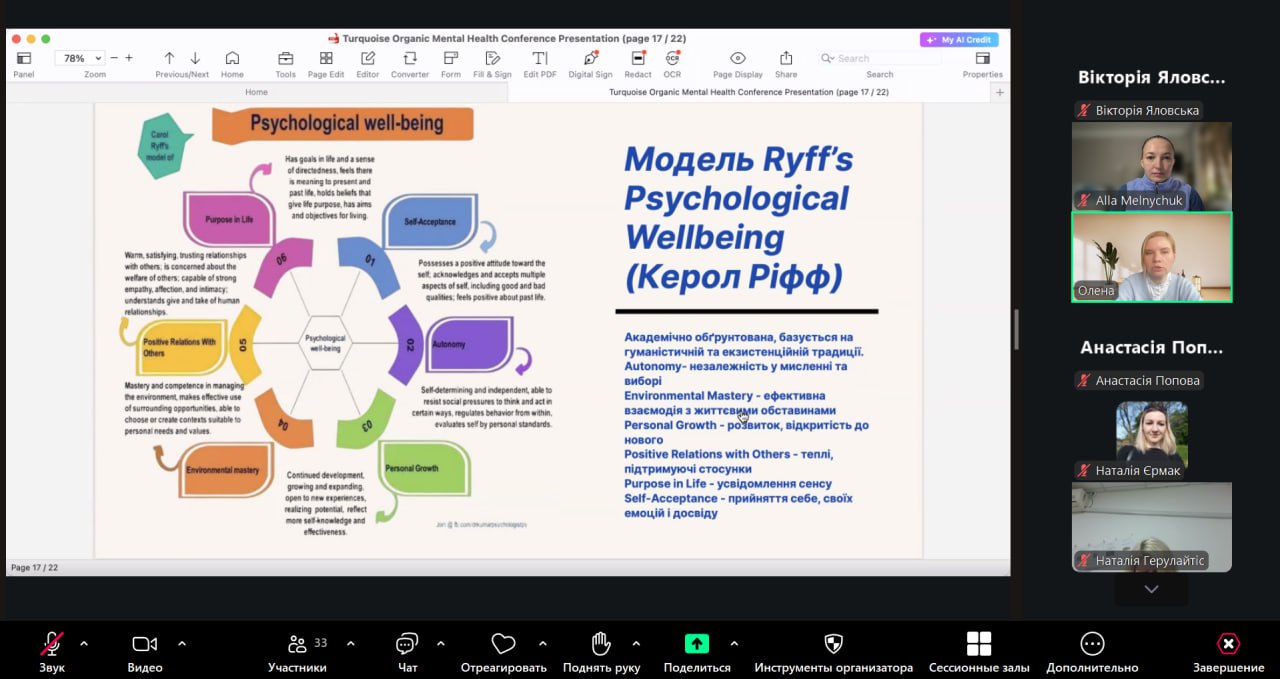 Спікеркою виступила Олена Таран – HR-бізнес партнер, організаційна психологиня, фасилітаторка, магістерка психології та громадського здоров’я, pre-MBA, засновниця проєкту Health Coaching & Well-being – простір зміцнення здоров’я, а також волонтерського арттерапевтичного проєкту Happy prostir у дитячих лікарнях. Олена є амбасадоркою розвитку фізичної культури та активною бігункою.