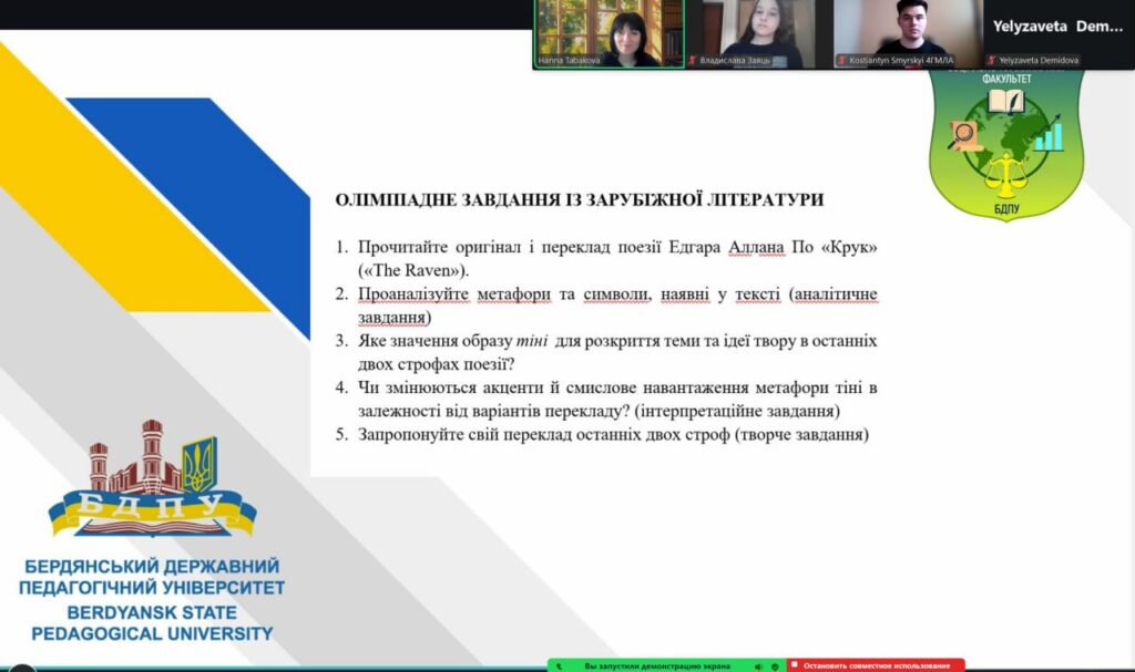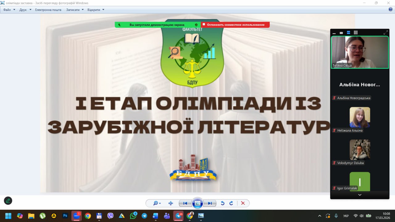 Днями кафедрою української та зарубіжної літератури і порівняльного літературознавства соціально-гуманітарного факультету БДПУ було проведено олімпіаду з історії зарубіжної літератури, у якій активну участь взяли здобувачі вищої освіти 1–3 курсів спеціальностей Б014 Середня освіта (англійська мова і зарубіжна література), 014.02 Середня освіта (Мова та зарубіжна література (із зазначенням мови), Б035 Філологія (германські мови та літератури (переклад включно), перша – англійська, друга – німецька).