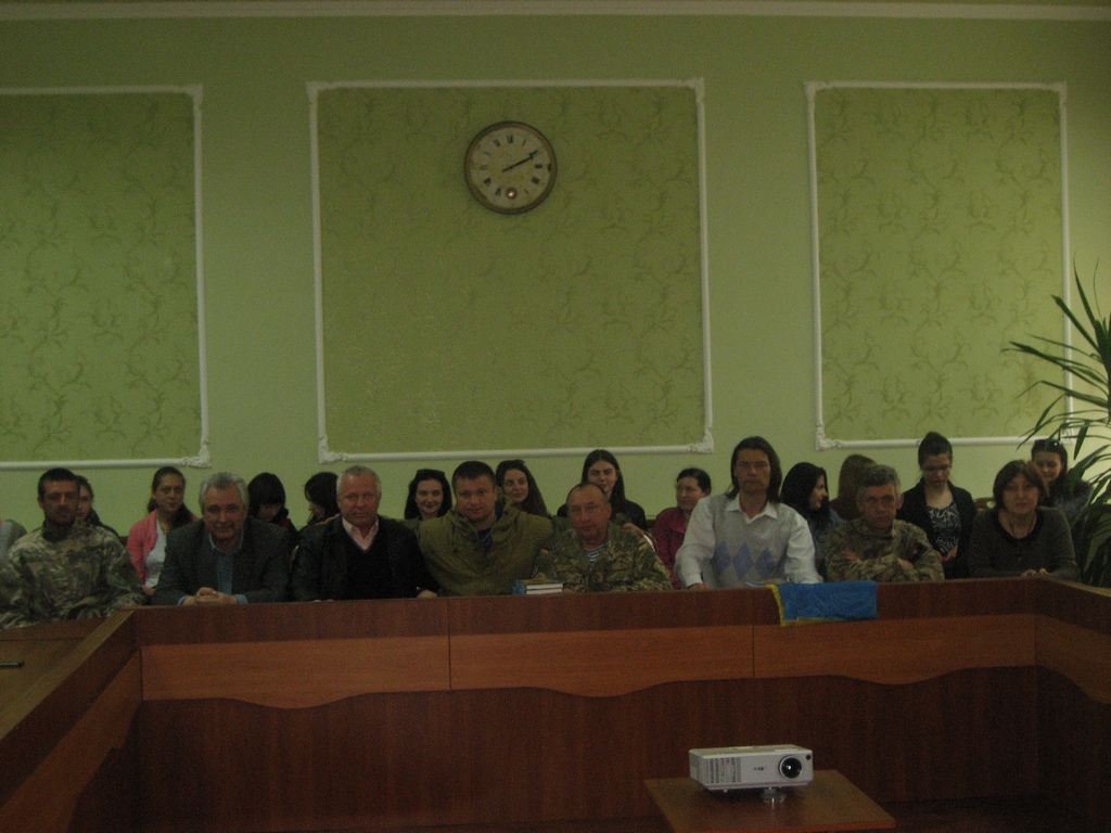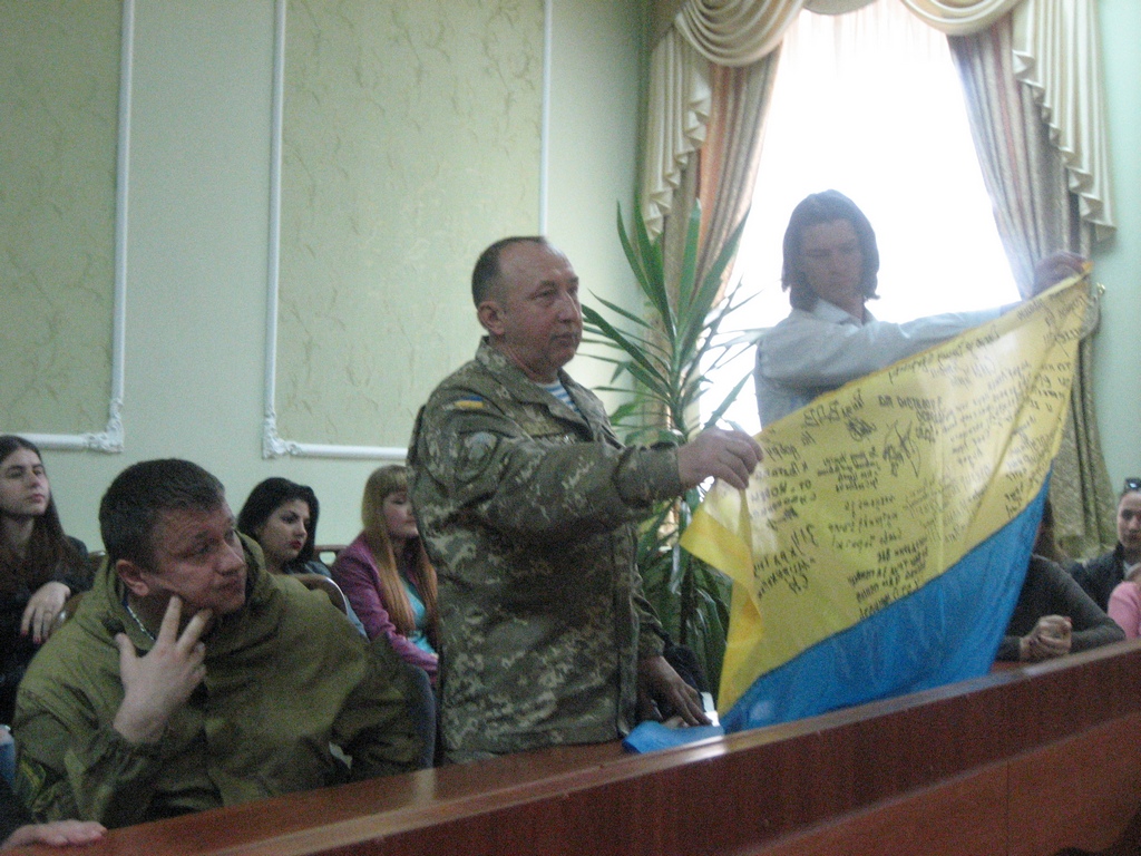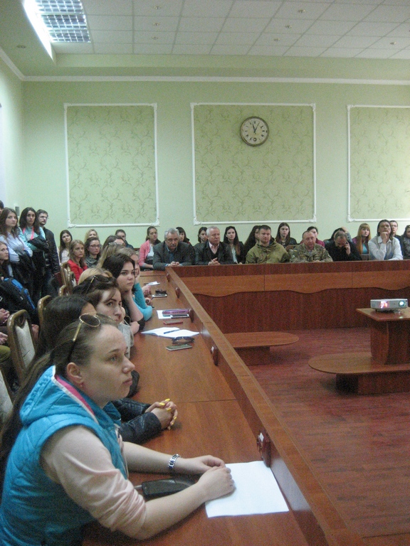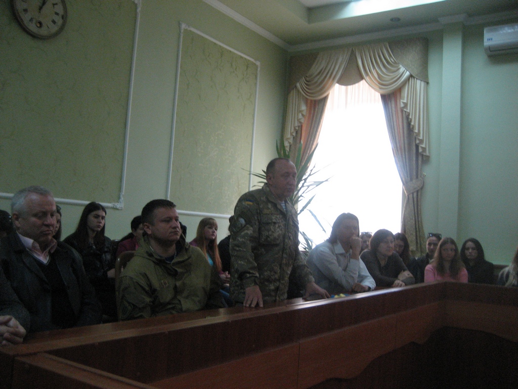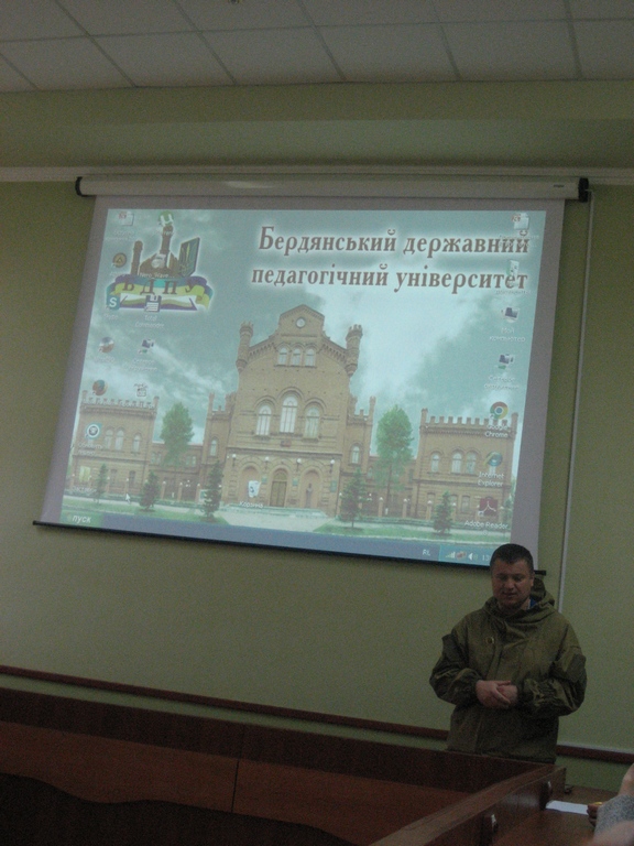 «Як далі жити та боротися?», «Що ще чекати від російського агресора?», «Чим допомогти фронтовикам?», «Як хлопцям воюється?», «Що таке «Правий сектор» і чого ним так лякають»… На ці та ще з десяток інших запитань давали сьогодні відповідь студентам БДПУ волонтер, недавній солдат-фронтовик Сергій Шарай та  командир 8-го батальйону ДУК ПС Андрій Червень, що базується на околицях Маріуполя. Зустріч проходила в університетській конференц-залі.