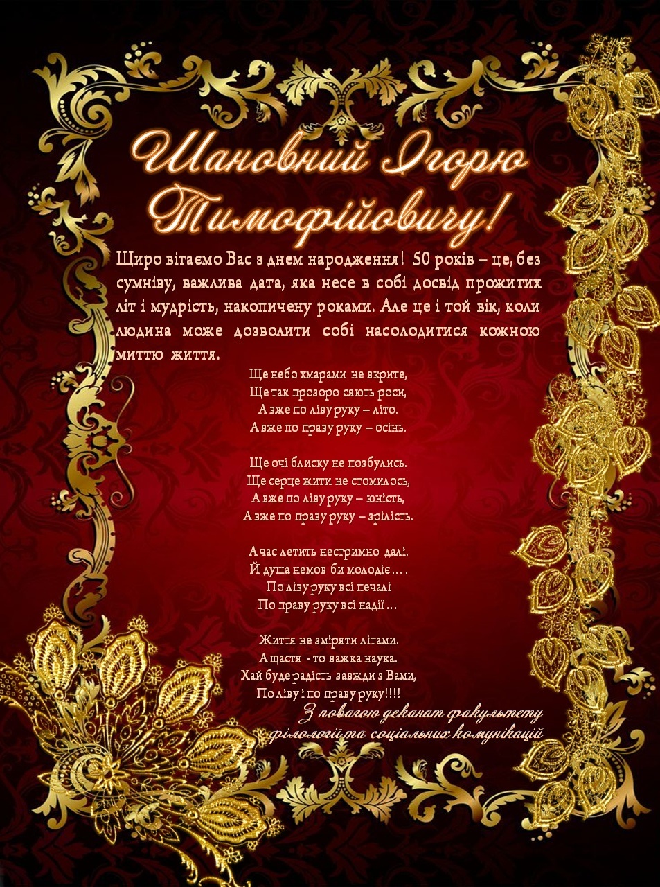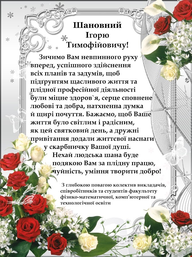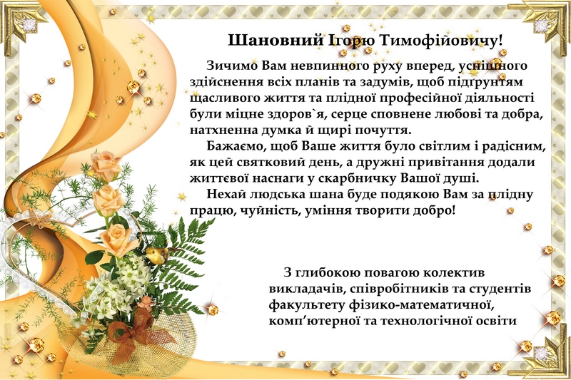 Щиросердно вітаємо Вас із золотим ювілеєм! Своє п’ятдесятиліття Ви зустрічаєте в розквіті творчих сил, збагачені життєвим досвідом. Сумлінною багаторічною працею, доброзичливими стосунками з колегами і студентами Ви заслужили глибоку повагу. Ви ніколи не зраджуєте принципам людяності, порядності, чесності. Тож нехай притаманні Вам інтелігентність, виваженість, цілеспрямованість та професіоналізм, невичерпна життєва енергія приносять успіхи в педагогічній та керівній діяльності, якій Ви сповна віддаєте свої знання, досвід, талант. Людська шана хай буде подякою за плідну працю, мудрість, чуйність, уміння дарувати добро, а Ваші наукові та педагогічні ідеї знаходять реальні втілення.