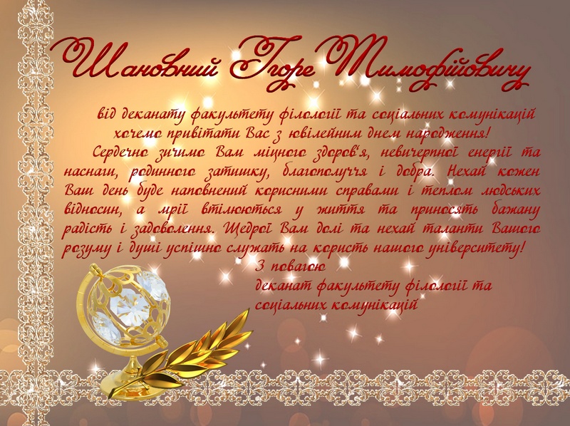 У цей святковий для Вас день дозвольте побажати Вам – авторитетному фахівцю, мудрому керівнику, – міцного здоров'я і щастя, творчого натхнення й душевного комфорту, амбітних планів, комфортних умов для роботи, вірних друзів. Щоб Ваше особисте життя надихало Вас до нових звершень у роботі, а робота стимулювала до добробуту і комфорту у Вашій оселі. Щиро зичимо сил і наснаги для здійснення найсвітліших сподівань та задумів, щоб Ваш професійний досвід, організаторські здібності та лідерські якості і надалі слугували на благо розбудови Університету на чолі з Вами, зміцненню та процвітанню України.