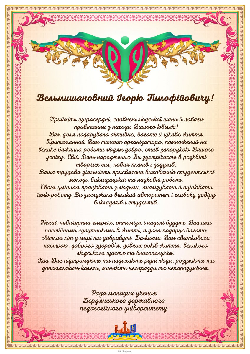 Щиро вітаємо Вас з чудовим золотим Ювілеєм! З почуттям глибокої поваги відзначаємо, що Ваша трудова біографія, організаторський талант і здібності нерозривно пов’язані з рідним університетом, його людьми і сповна віддані їм, особливо в період діяльності на відповідальній посаді ректора престижного Бердянського вишу. Ми високо цінуємо Вашу працелюбність і компетентність, життєву мудрість і діловитість, які створили Вам заслужений авторитет і повагу серед колег по роботі. Ваша толерантність, доброзичливість у стосунках з людьми служать прикладом для наслідування. Висловлюємо Вам, Ігорю Тимофійовичу, сердечну вдячність і глибоку шану за Вашу невтомну працю.