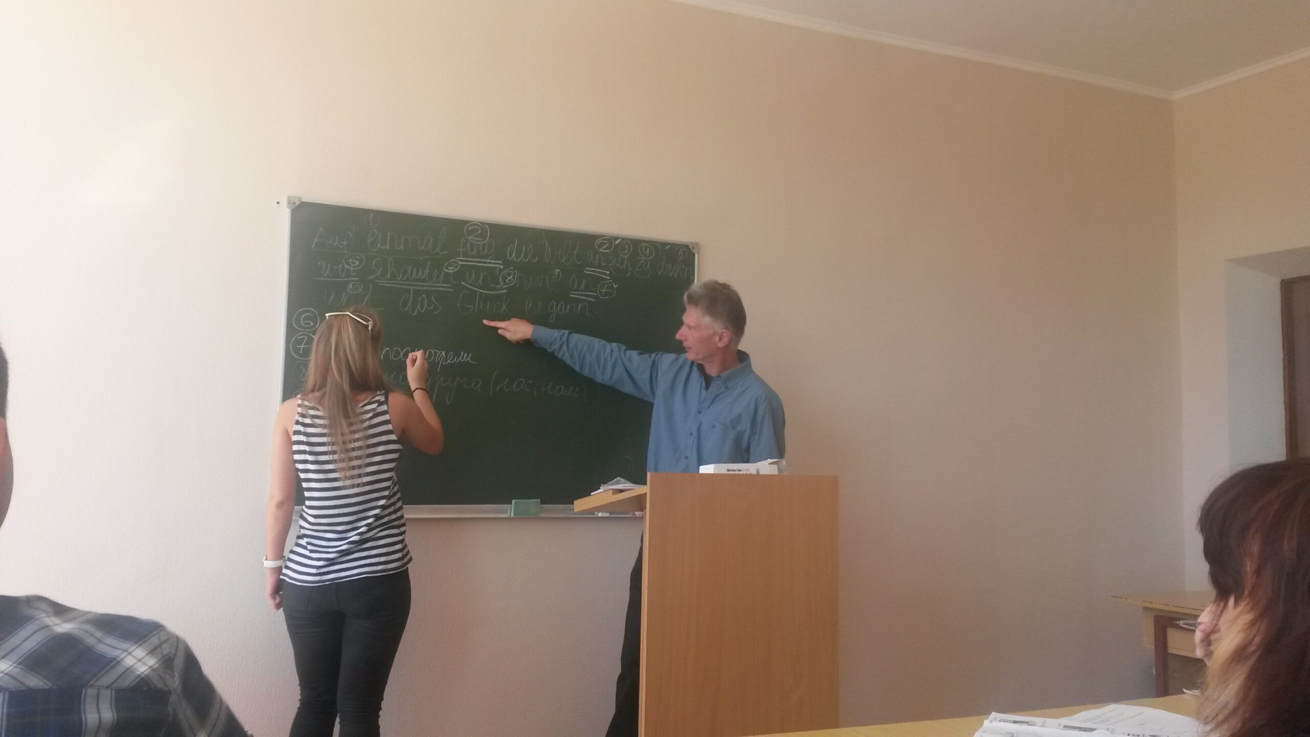 У вересні ц. р. кафедра іноземних мов і методики викладання ІФСК БДПУ запросила професора порівняльного мовознавства Фрайбурзького університету імені Альберта Людвіга Атанасіуса Маустакаса (Німеччина) для проведення практичних занять та читання лекцій з курсів «Країнознавство Німеччини», «Практична граматика німецької мови», «Порівняльна граматика німецької мови», «Історія німецької мови», «Діалектологія німецької мови» для студентів філологічних та нефілологічних спеціальностей БДПУ.