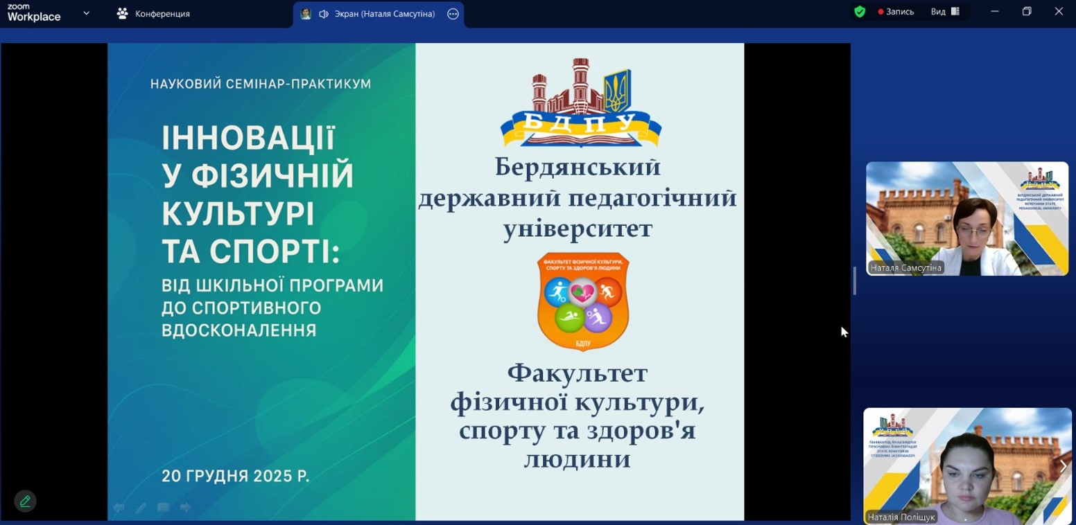 20 грудня 2025 року на базі Бердянського державного педагогічного університету на факультеті фізичної культури, спорту та здоров’я людини відбувся науковий семінар-практикум «Інновації у фізичній культурі і спорті: від шкільної програми до спортивного вдосконалення», організований кафедрою фізичної культури, спорту та методики викладання.