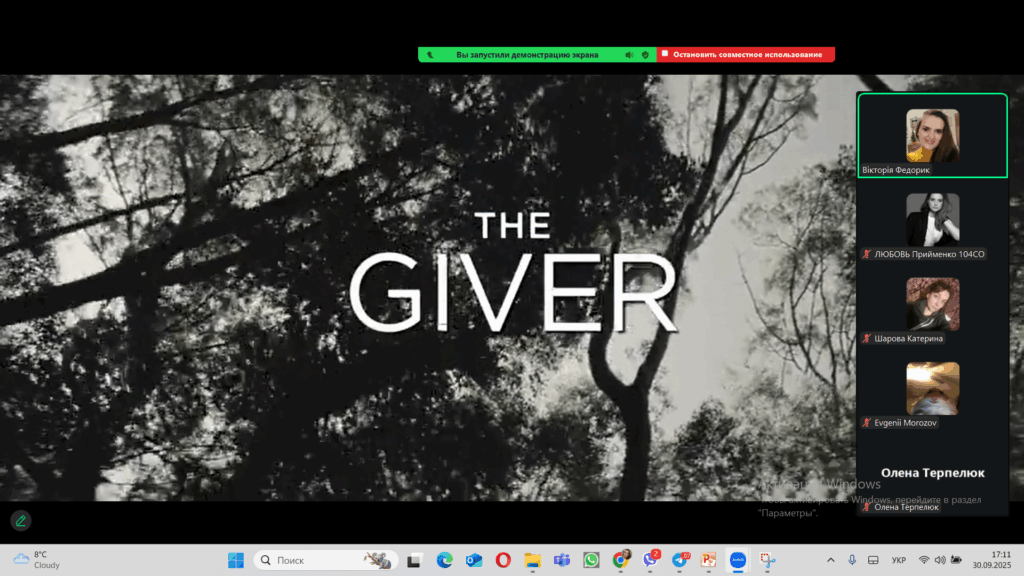 Учасники кінолекторія разом зі старшою викладачкою кафедри психології Вікторією Федорик проаналізували фільм «Посвячений» (The Giver, 2014). Картина занурює глядачів в «ідеальне майбутнє», де завдяки технологічним інноваціям людство назавжди позбувається болю, війн, конфліктів та хвороб. Проте, така ідеальна картинка спонукає глядача до розуміння високої ціни спокою: це світ, де немає ні любові, ні щастя, ні смутку, ні спогадів.